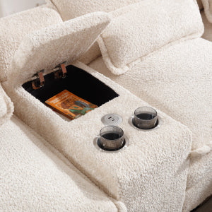 - The chenille sofa comes with a console that can be stored, cup holders and USB ports for convenience.