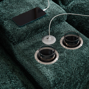 - The chenille sofa comes with a console that can be stored, cup holders and USB ports for convenience.