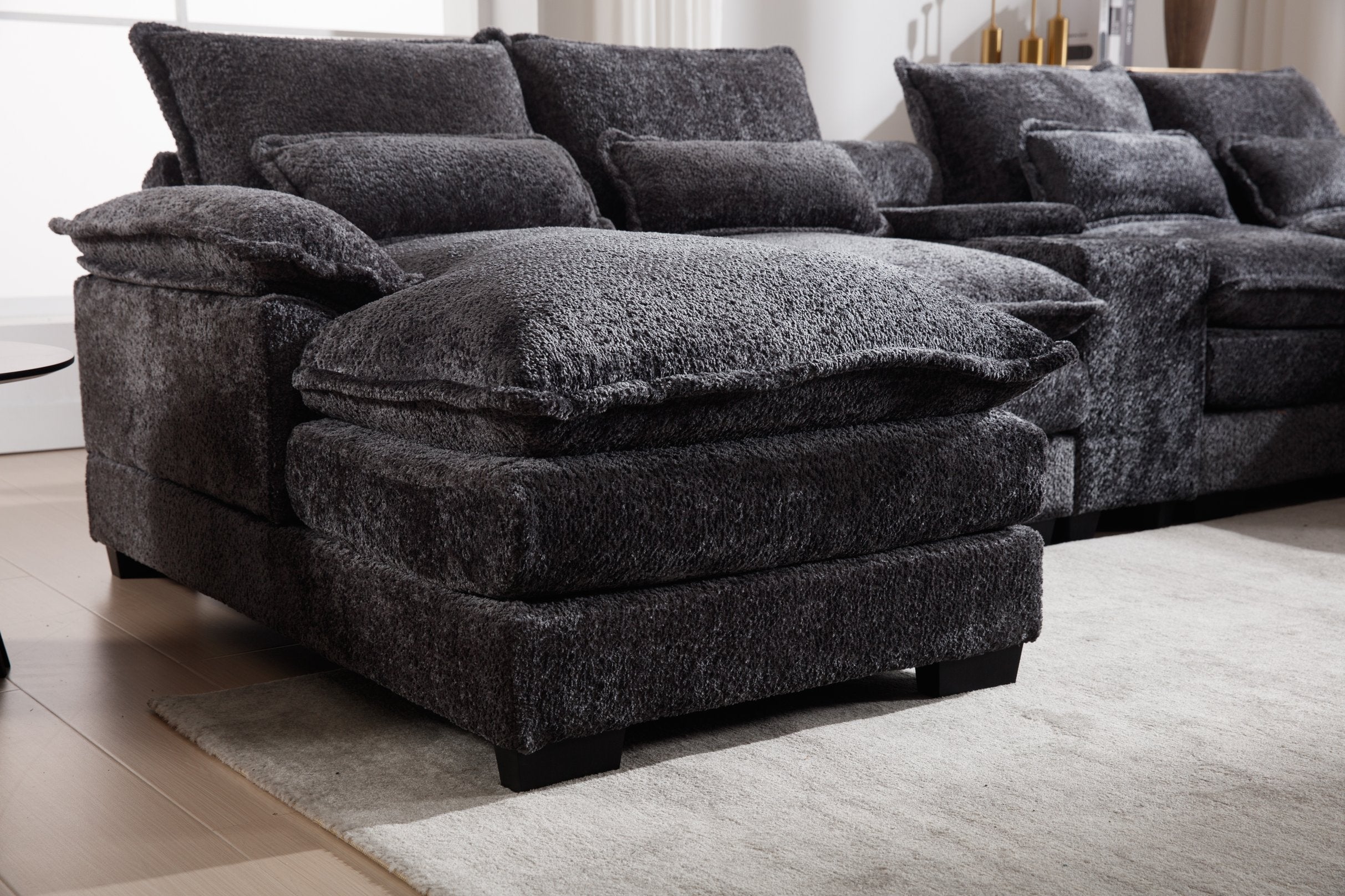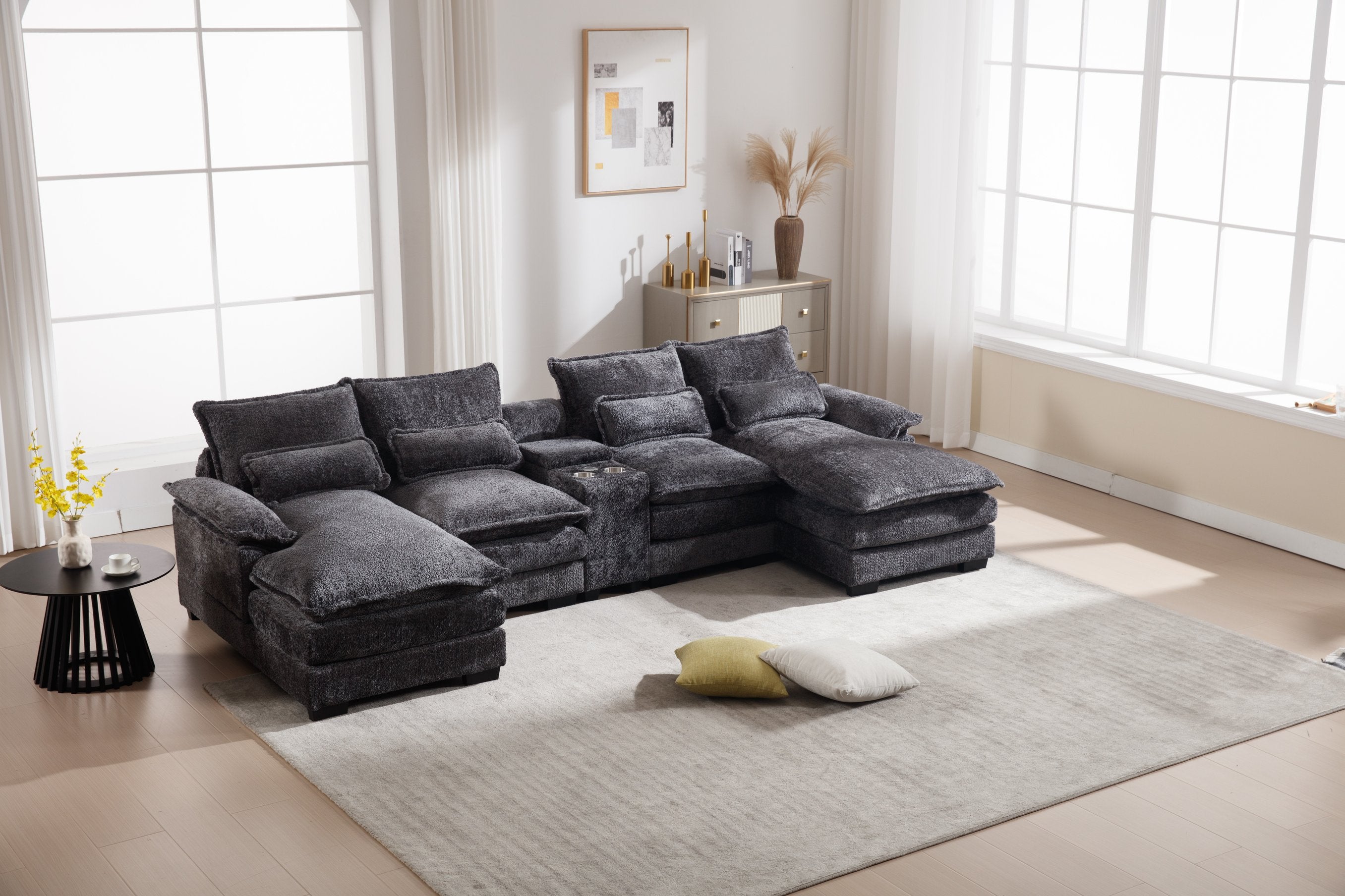 Transform your living area with this modern U-shaped sectional that blends luxury, comfort, and smart functionality. Upholstered in soft gray chenille, it offers plush seating for gatherings, flexible lounging with a chaise and sleeper option, and integrated conveniences like a retractable console, cupholders, and USB ports—ideal for apartments, family rooms, or office lounge spaces.