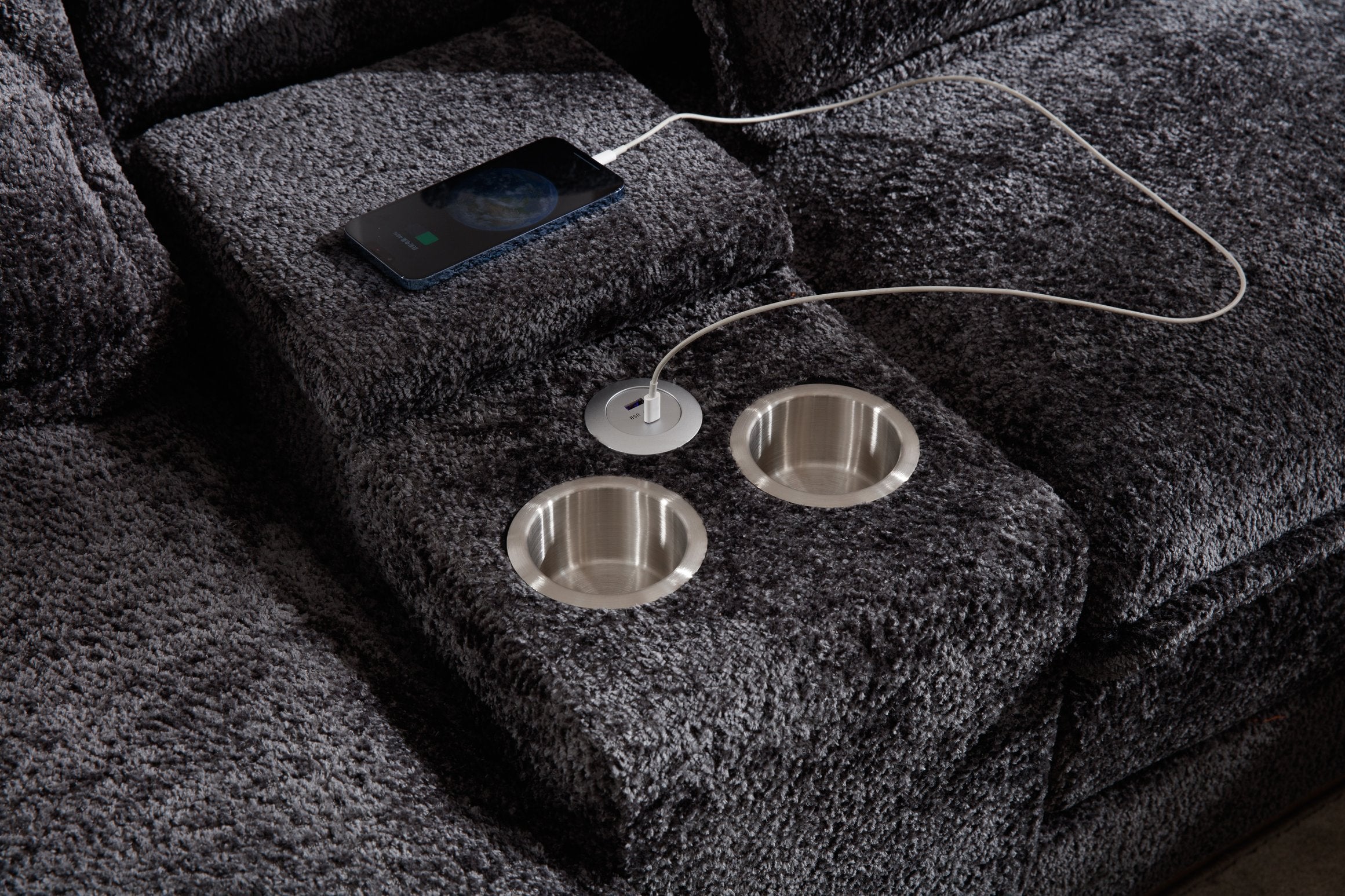 - The chenille sofa comes with a console that can be stored, cup holders and USB ports for convenience.