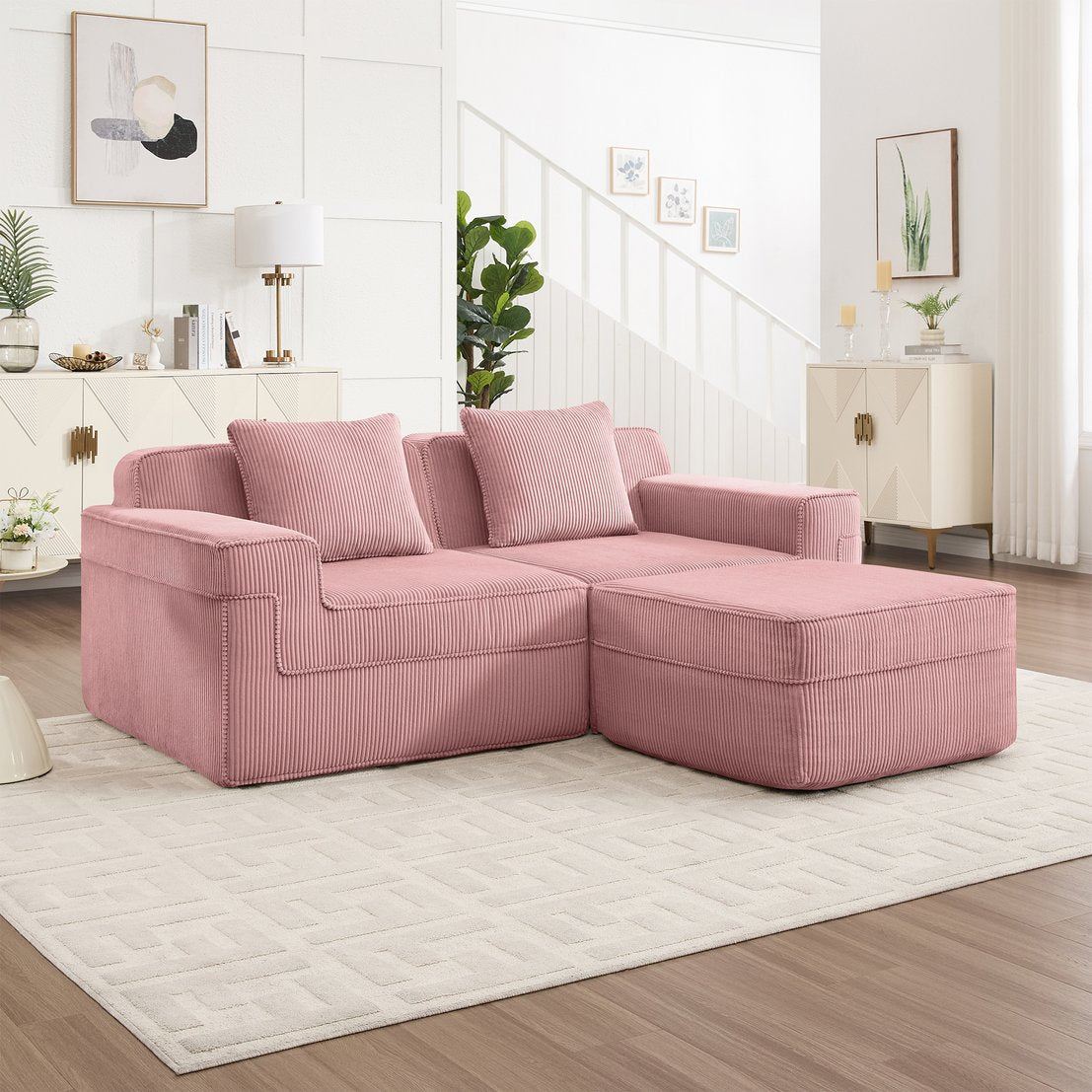 Experience cloud-like comfort and contemporary style with this modular 2-seat L‑shape sectional. Designed for effortless setup and everyday lounging, its boneless construction and plush corduroy upholstery create a cozy, pet-friendly centerpiece that adapts to your space. Includes removable throw pillows and a movable ottoman for flexible seating and lounging arrangements.