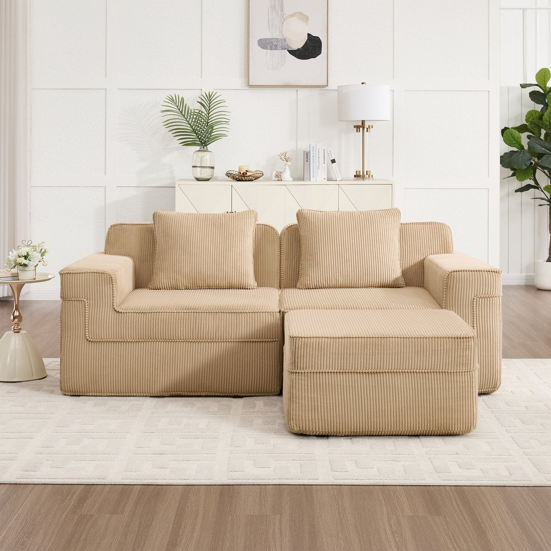 Experience cloud-like comfort and modern versatility with this modular 2-seat L-shape sectional. Wrapped in soft camel corduroy, the boneless design invites lounging, napping, and casual entertaining while the movable ottoman and throw pillows let you customize seating arrangements to suit any space or mood.