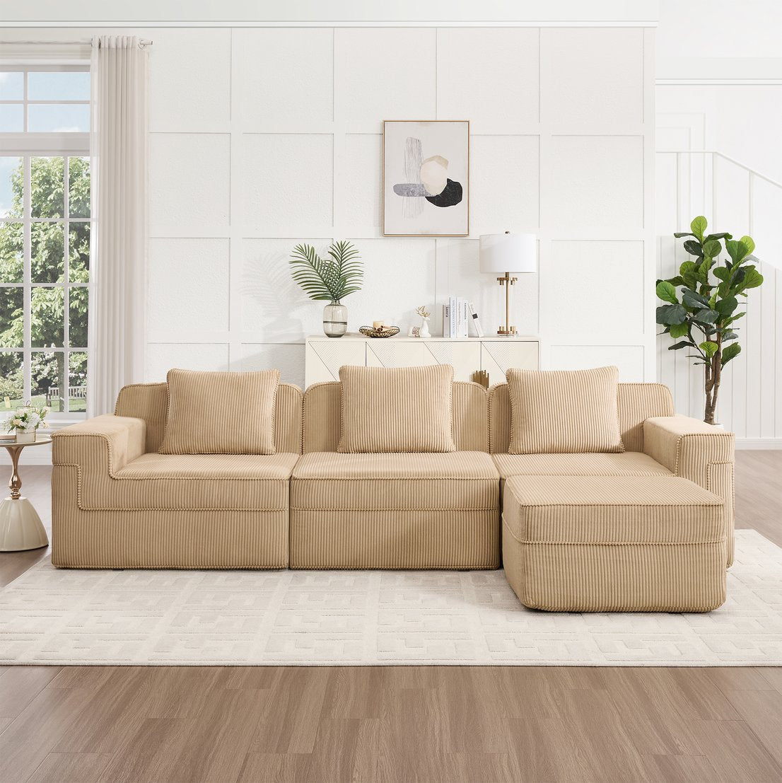 Experience cloud-like comfort and modern versatility with this modular 3-seat L-shape sectional. Upholstered in soft camel corduroy, the boneless design invites relaxation and rearrangement while the included throw pillows and movable ottoman let you customize seating for lounging, napping, or entertaining. Low-maintenance and pet-friendly, this sectional combines cozy cushioning with a contemporary silhouette for living rooms, family rooms, or media spaces.
