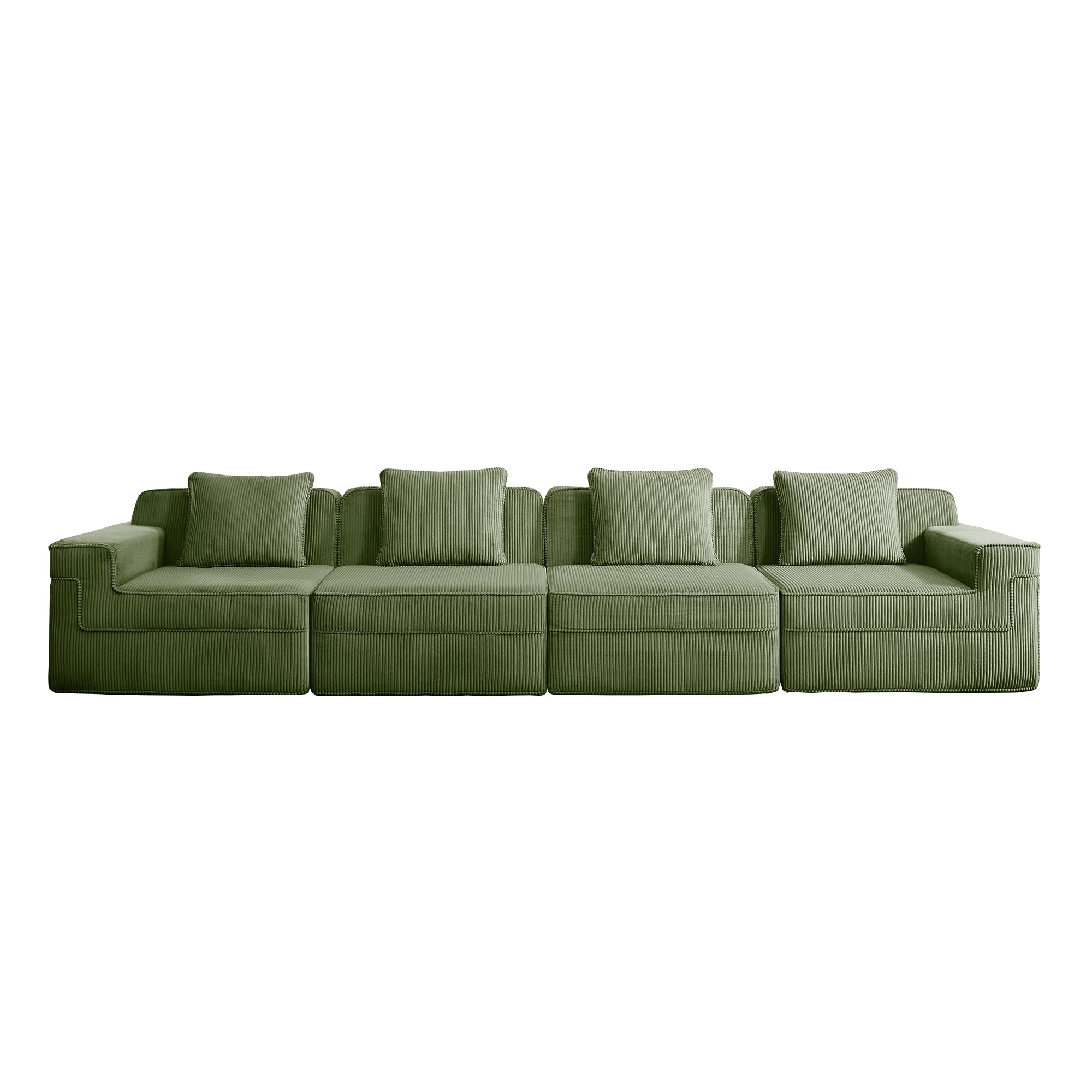 Experience cloud-like relaxation with this modern modular 4-seat boneless sectional. Designed for effortless setup and everyday comfort, its plush corduroy upholstery and high-resilience foam create a cozy, durable centerpiece for living rooms, family rooms, or lounge spaces. The versatile configuration and removable throw pillows let you customize seating, reclining, and lounging to suit gatherings or quiet downtime.