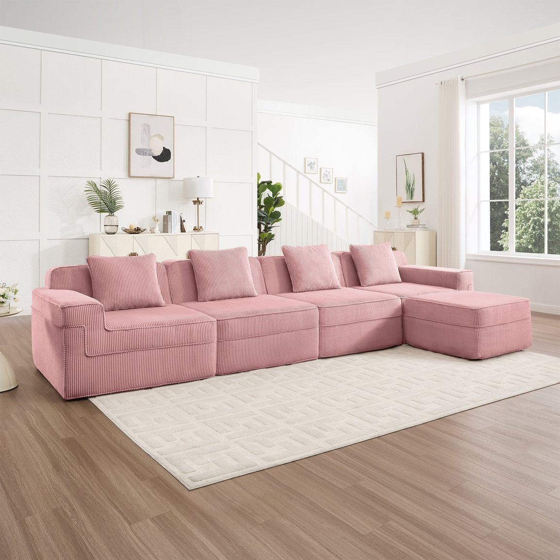 Experience cloud-like comfort and modern versatility with this modular 4-seat L-shape sectional. Upholstered in plush corduroy in a soft pink hue, this boneless sofa invites you to lounge, nap, or entertain with effortless style. Its modular design and included movable ottoman let you customize the layout to suit your space, while high-resilience foam and generous cushioning deliver lasting support and sink-in softness.
