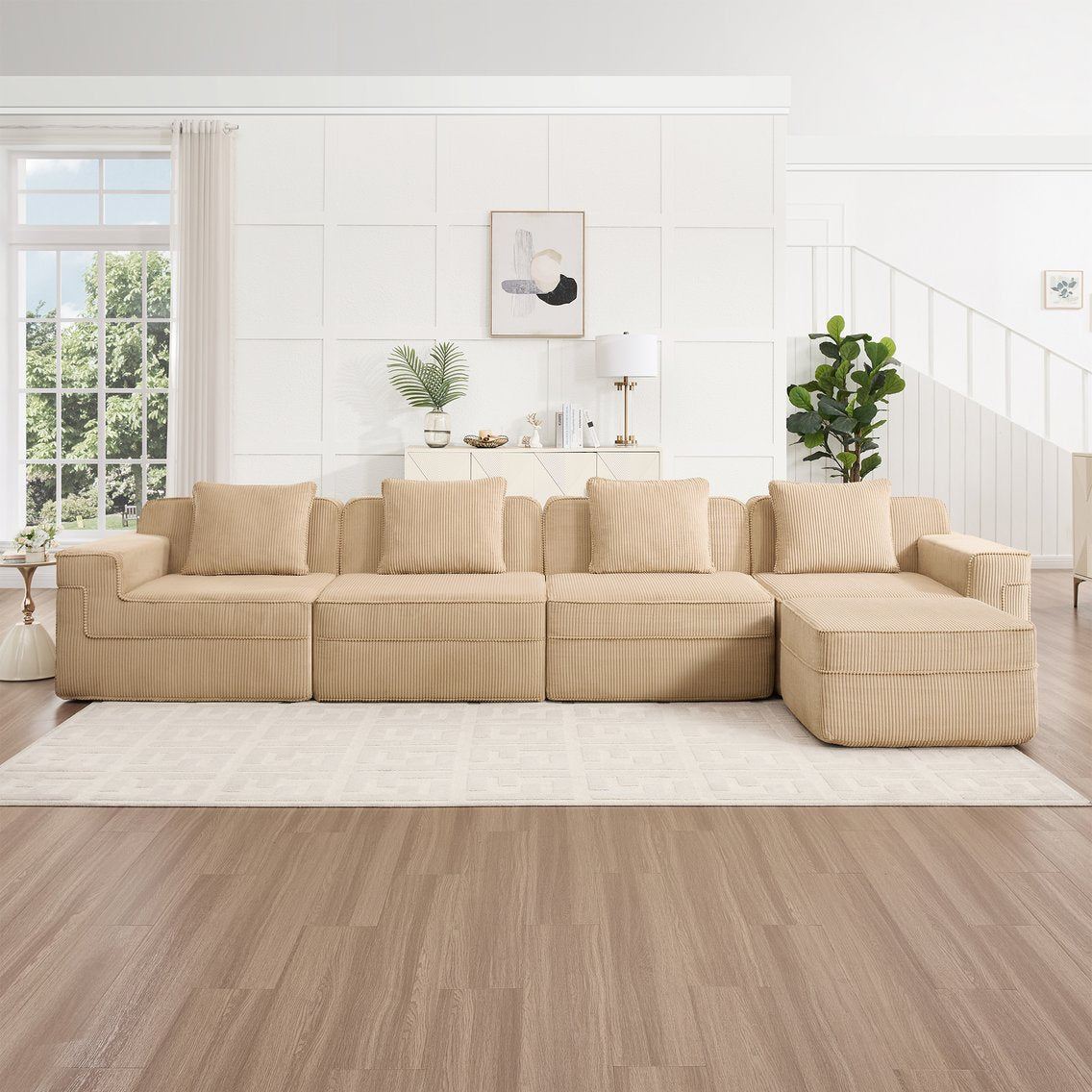 Experience cloud-like comfort and modern versatility with this modular 4-seat L-shaped sectional. Designed for effortless setup and everyday luxury, the boneless construction and plush corduroy upholstery create a cozy, inviting seating area perfect for lounging, entertaining, or family time. Each component can be arranged to suit your space—complete with removable throw pillows and a movable ottoman for added flexibility.