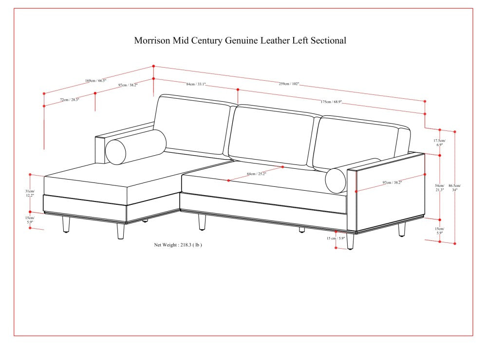 - Generously sized to offer comfortable seating for 4 people, this left-facing, mid-century modern sectional sofa measures 102-inches wide and accommodates up to 1,200 lbs.