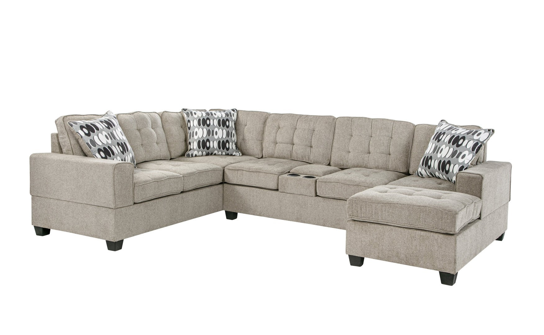 Bring home timeless comfort with the Oslo sectional—designed to anchor your living space with versatile seating, soft textured upholstery, and thoughtful conveniences for everyday living. Its neutral gray tone and tailored details make it easy to pair with any decor, while functional features like a reversible chaise, cup holders, and hidden storage enhance relaxation and organization.