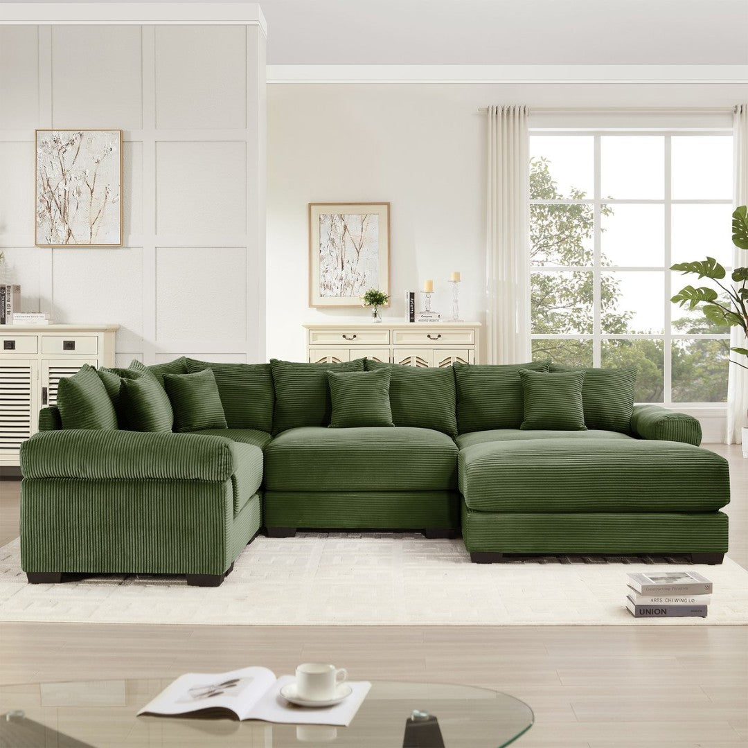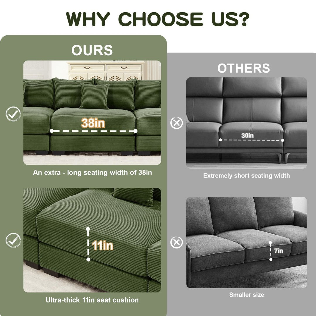 Experience cloud-like comfort with this oversized modular sectional, crafted for relaxed lounging and versatile living. Wrapped in premium corduroy, the deep seating and ergonomic contours invite you to sink in, while the sturdy solid-wood frame and high-density cushioning deliver lasting support. Whether arranged as a cozy corner sofa or an extended lounge with the included ottoman, this sectional adapts to your space and lifestyle with effortless style.