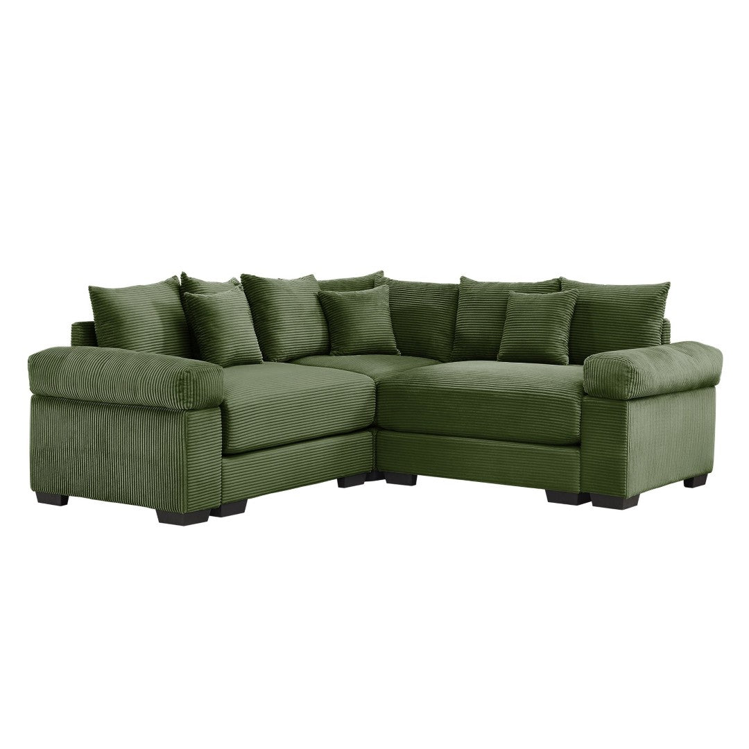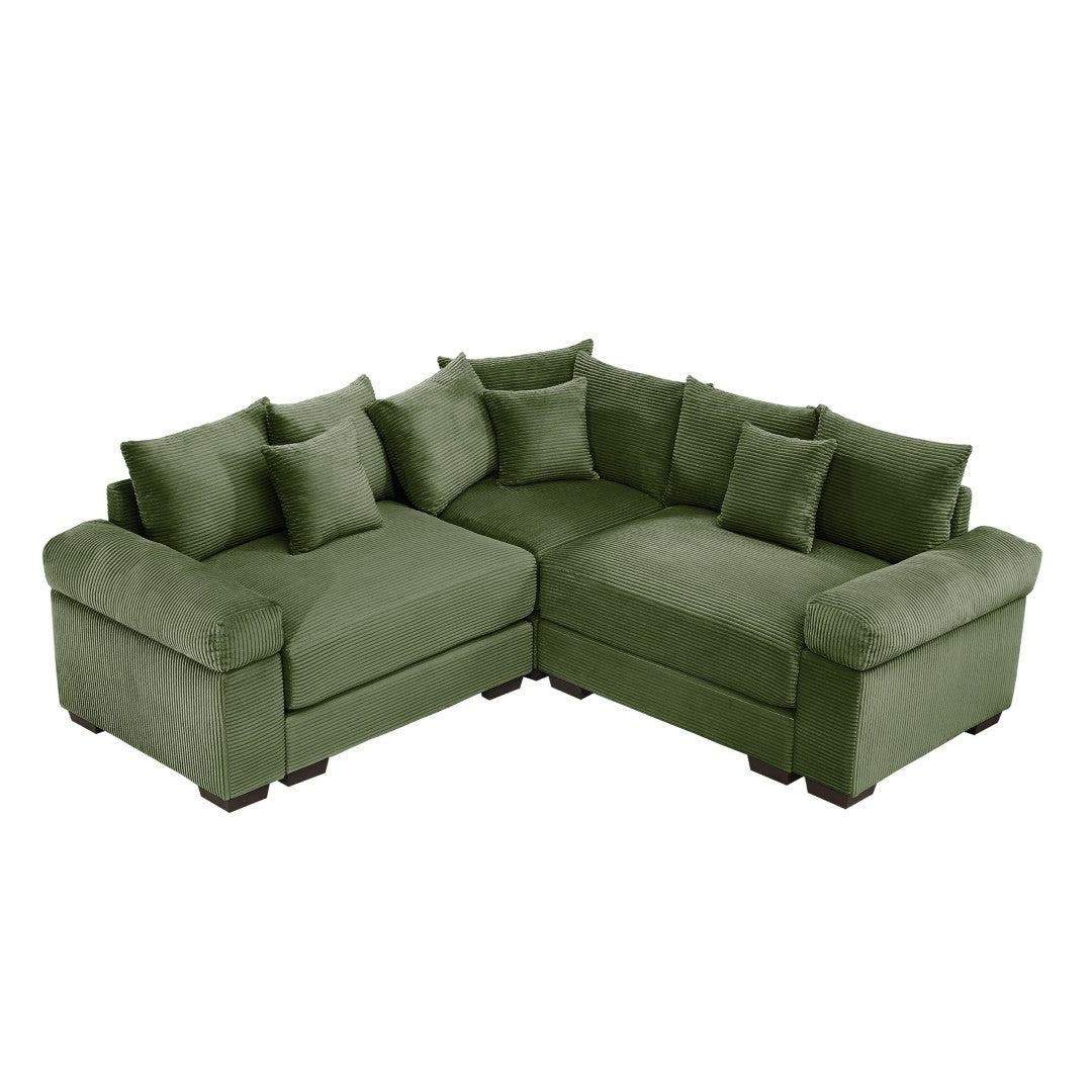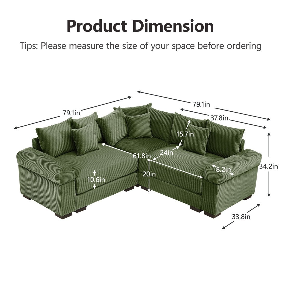 Sink into cloud-like comfort with this oversized modular sectional, designed to combine plush relaxation with flexible styling. Upholstered in premium corduroy and supported by a solid wood frame, this convertible sofa offers deep seating, extra-wide cushioned armrests, and customizable configurations to suit living rooms of any size. Ideal for lounging, entertaining, or adding a cozy focal point, it arrives ready for quick assembly and includes ten throw pillows for added support and style.