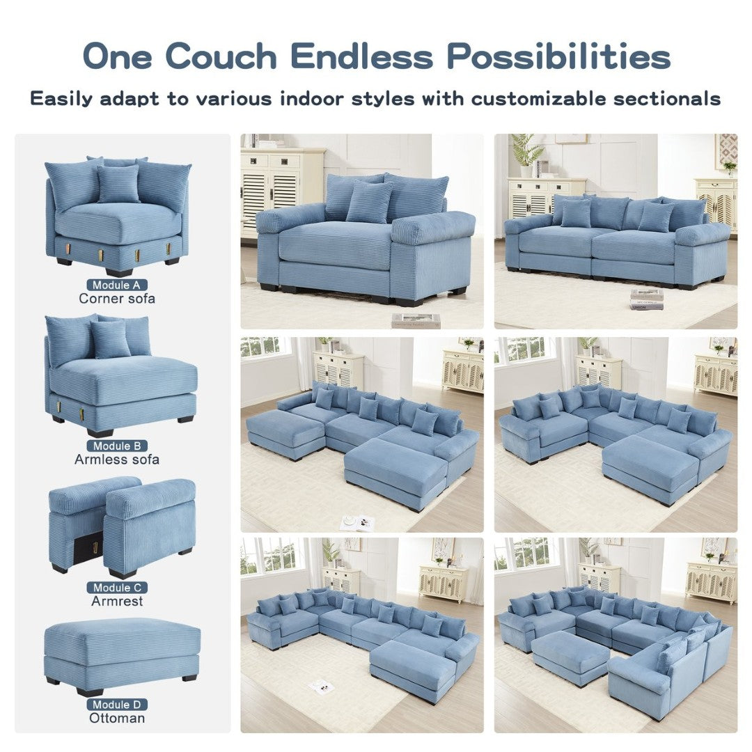 Experience cloud-like comfort and modern versatility with this oversized modular sectional, upholstered in premium blue corduroy. Designed for lounging, entertaining, and adaptable living spaces, it pairs plush ergonomics with durable construction and a movable ottoman so you can personalize your setup for any room.