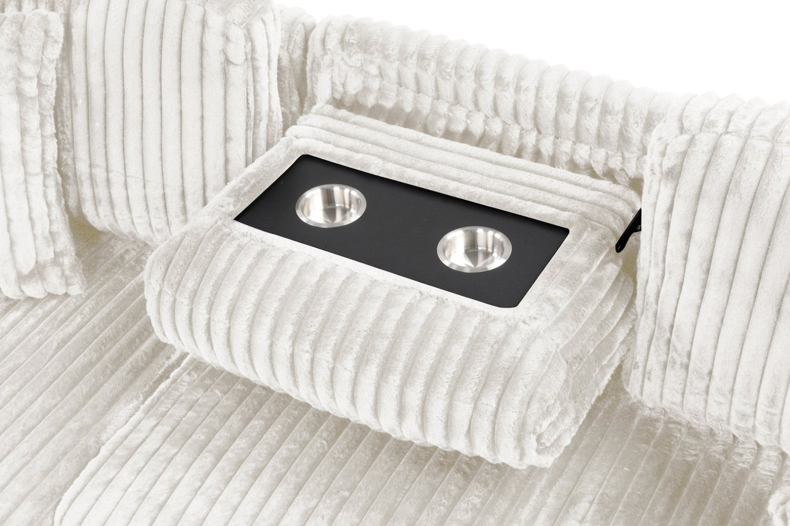 - Convenience Features: Dropdown tray with built-in cup holders and integrated USB ports in the armrest for device charging