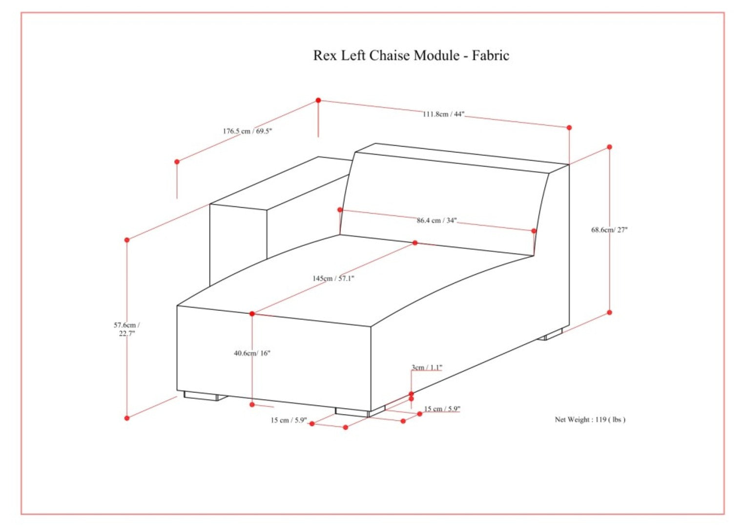 - This modern-style left chaise sofa module with a clean, boxy silhouette and a gently sloping back can be used on its own as an asymmetrical chaise lounge or combined with other pieces in our handcrafted Rex Modular Sofa Collection; this module accommodates up to 600 lbs.