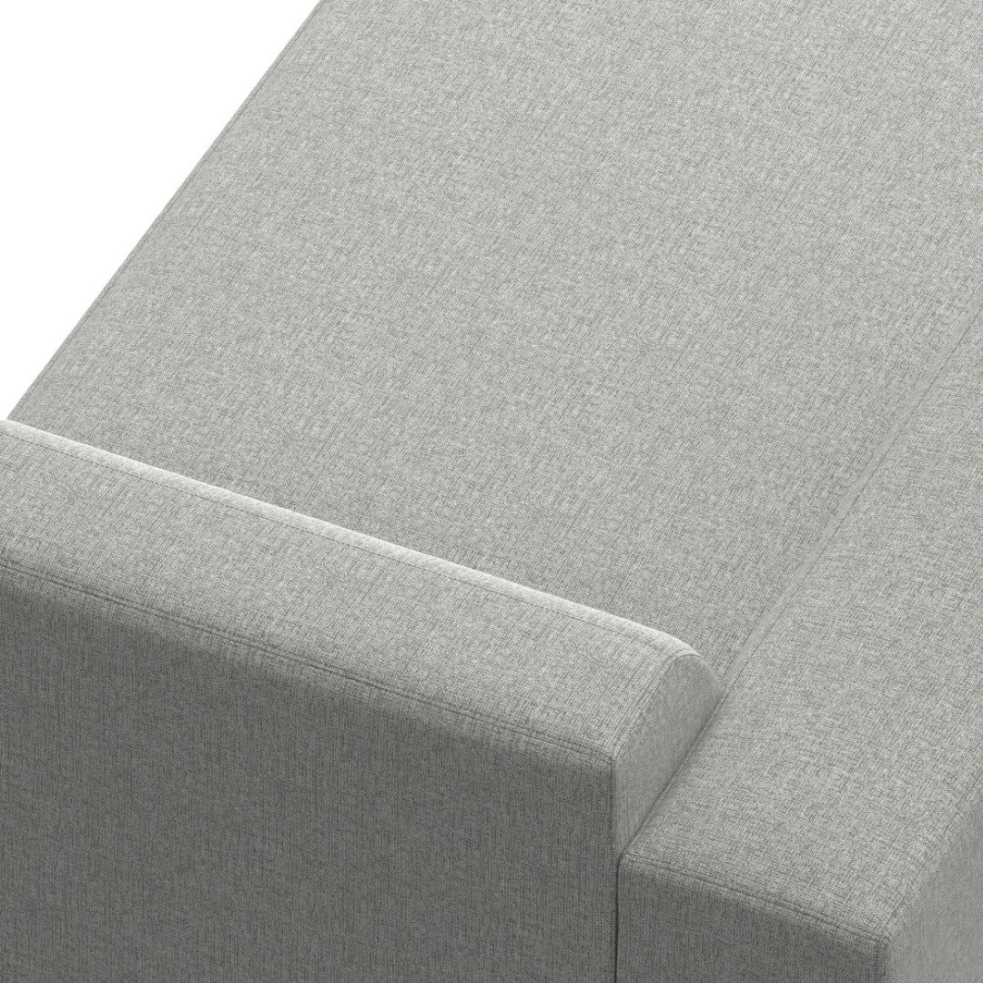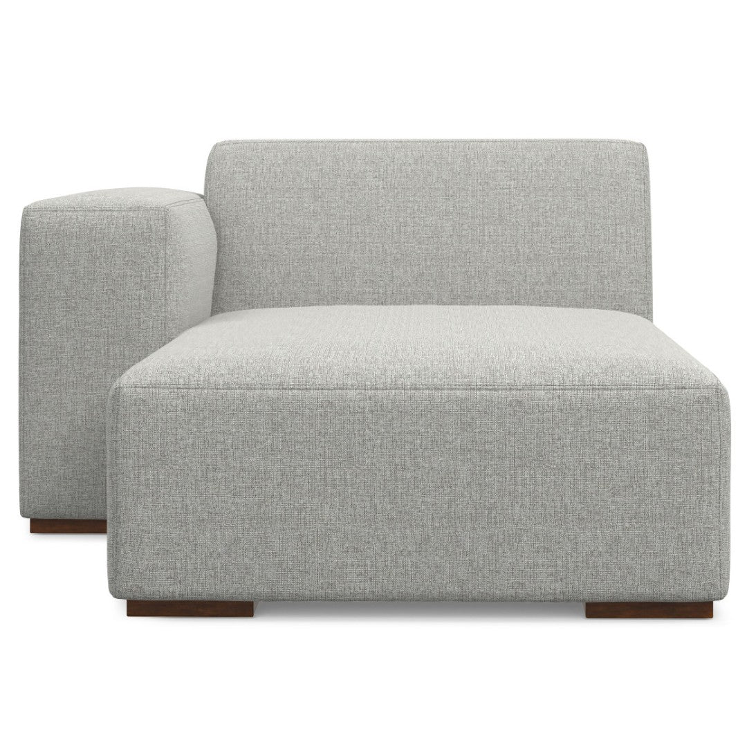 Bring modern comfort and versatile design to your living space with this left chaise sofa module from the Rex Modular Sofa Collection. Featuring a clean, boxy silhouette and a gently sloping back, this piece works equally well as a standalone asymmetrical chaise lounge or attached to other Rex modules for a customized sectional. Upholstered in pale grey performance fabric made from 100% recycled polyester, it combines eco-friendly materials with durable, easy-care performance and refined styling.