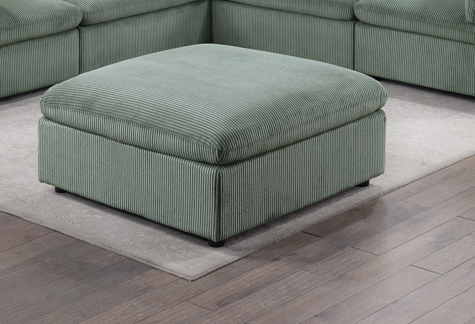 Create a cozy, customizable seating arrangement with this modern modular sectional set. Wrapped in soft corduroy and supported by low, barely visible legs, the collection offers a warm sage tone and versatile configuration options to fit living rooms of various sizes—assemble pieces together for a large sectional or spread them out as individual seats and an ottoman.
