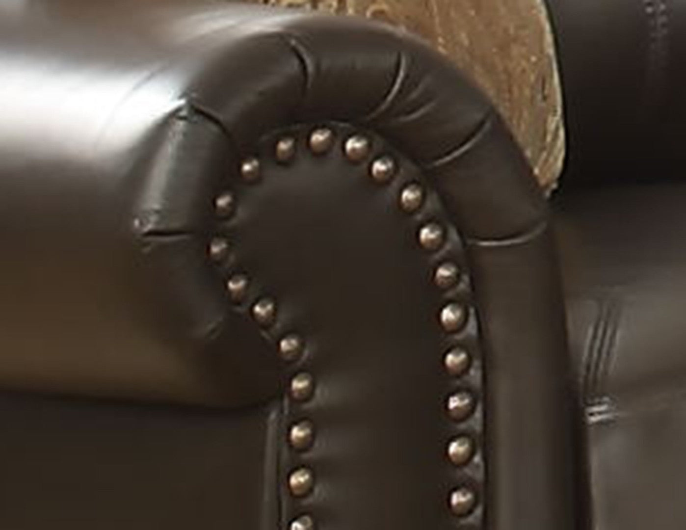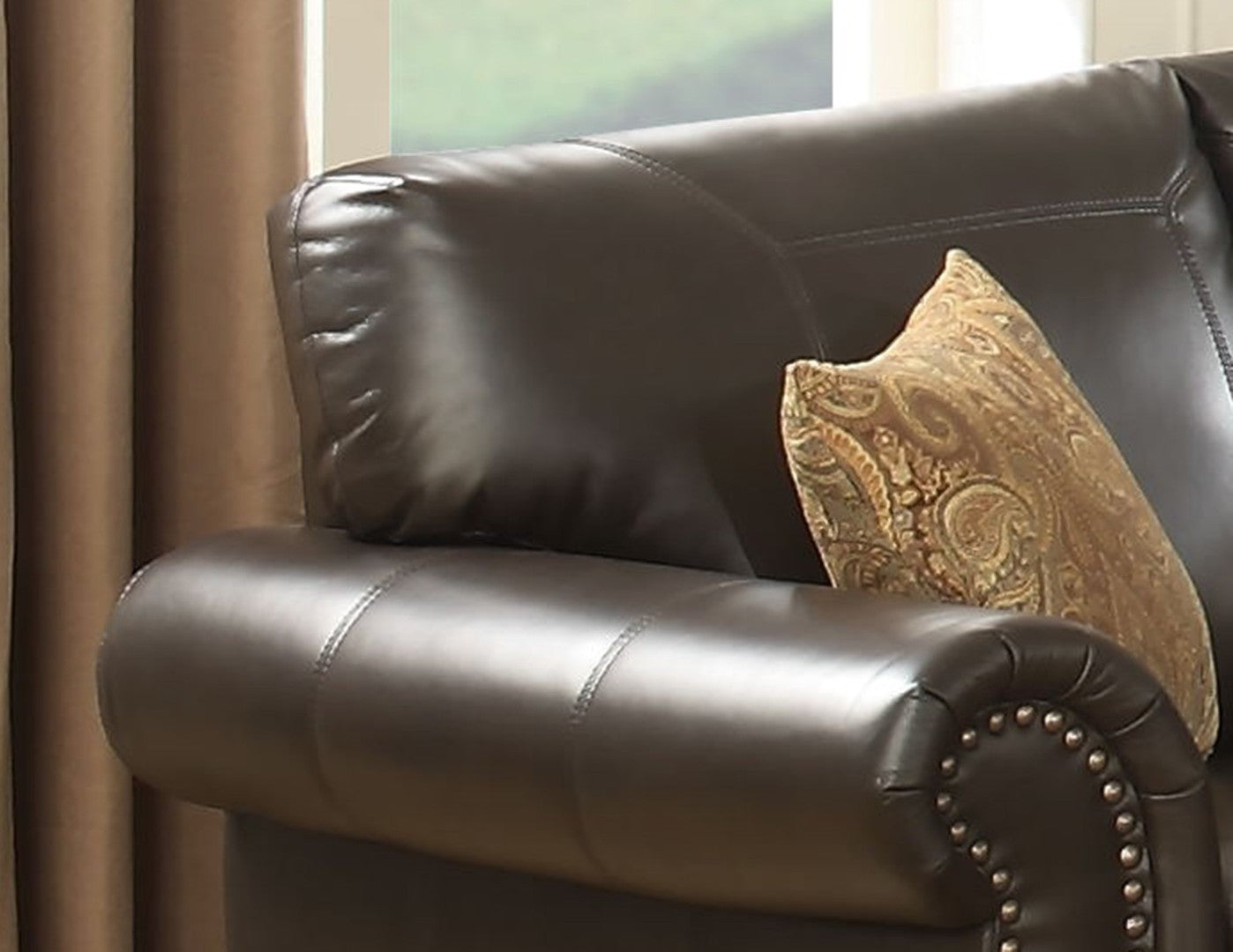- Design Details: Decorative antique brass nail head trim and curved armrests enhance visual appeal and offer ergonomic support