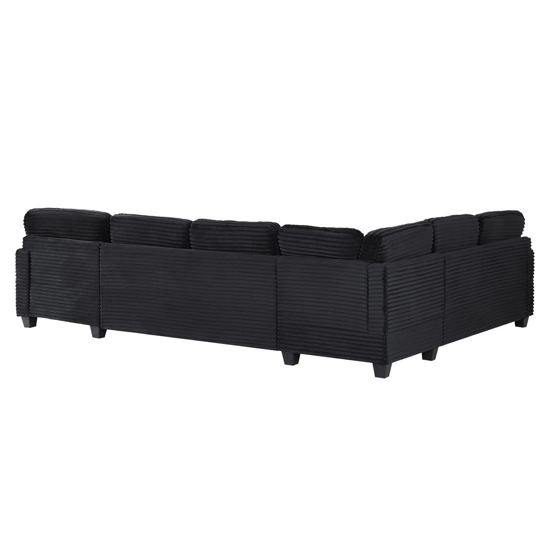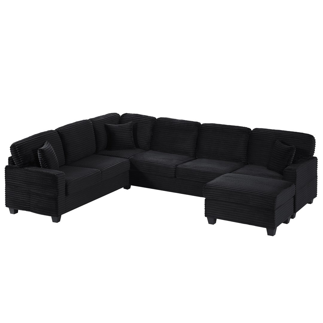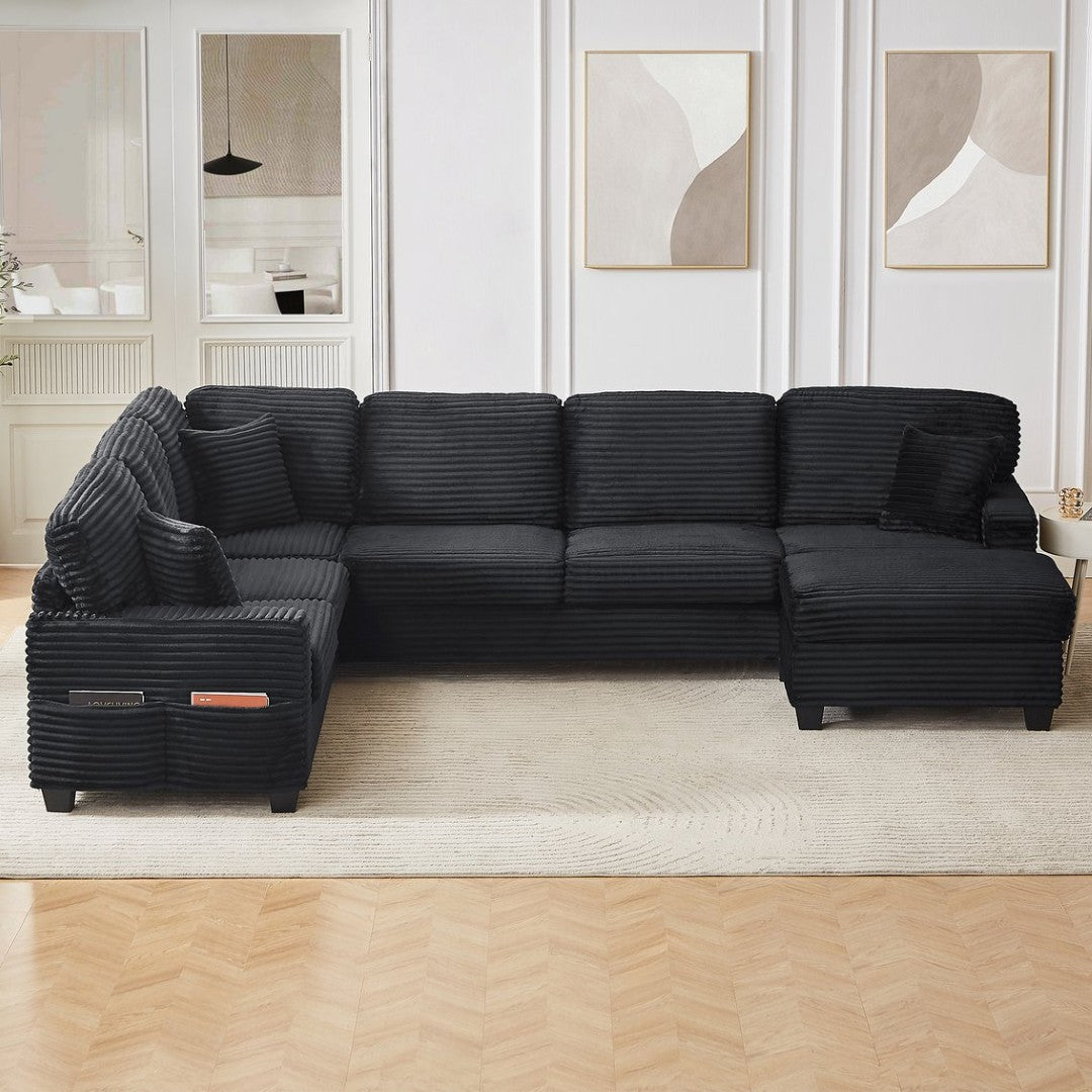 This modular U-shaped sectional blends modern style with everyday practicality — a comfortable, adaptable centerpiece for living rooms, family rooms, or entertainment spaces. Upholstered in soft ribbed corduroy with pocket-spring and foam seating, it offers supportive comfort while thoughtful details like side storage pockets and a movable ottoman keep essentials organized and the layout flexible for lounging or hosting.