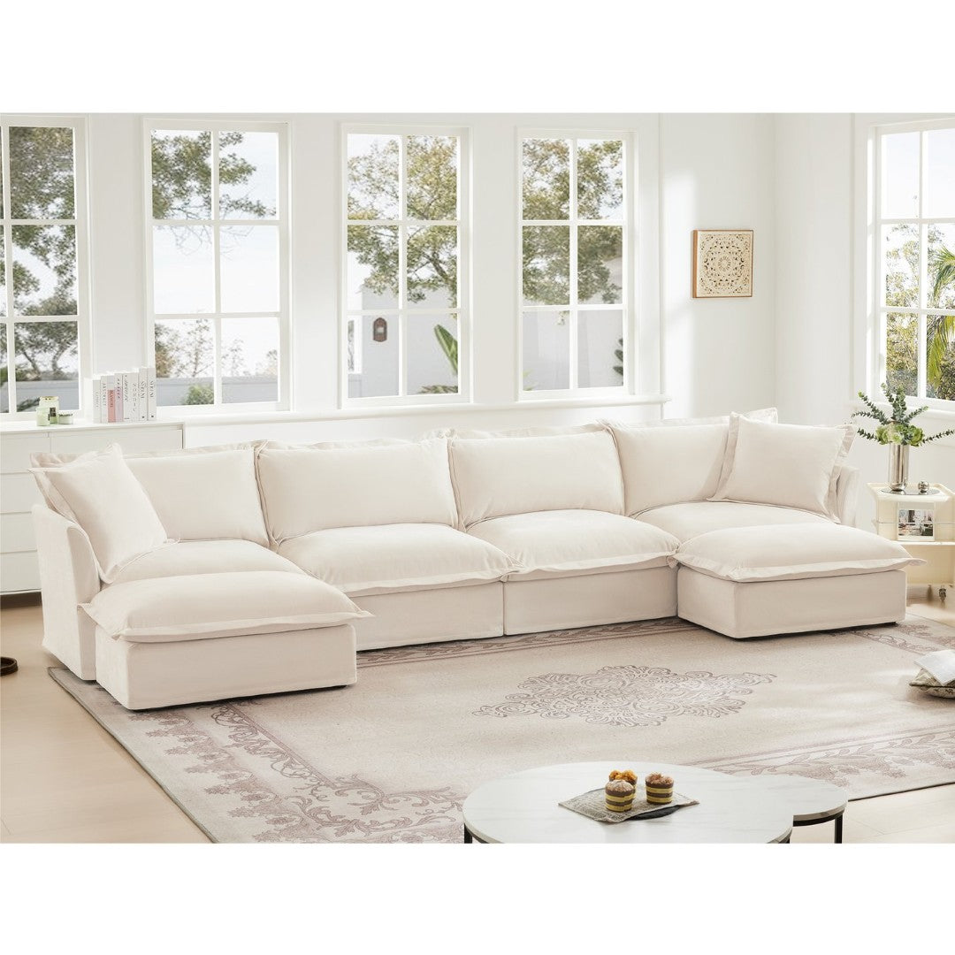 Sink into cloud-like comfort with this slipcovered U-shape sectional designed for modern living rooms and apartments. Upholstered in soft, breathable chenille, the wide and deep seats, high-back pillows, and French-edge detailing create an inviting, elegant centerpiece that adapts to your space and lifestyle. Removable, washable covers and a sturdy wood frame make this sectional practical for families and renters, while modular sections and optional ottomans let you customize seating configurations for lounging, entertaining, or home theater use.