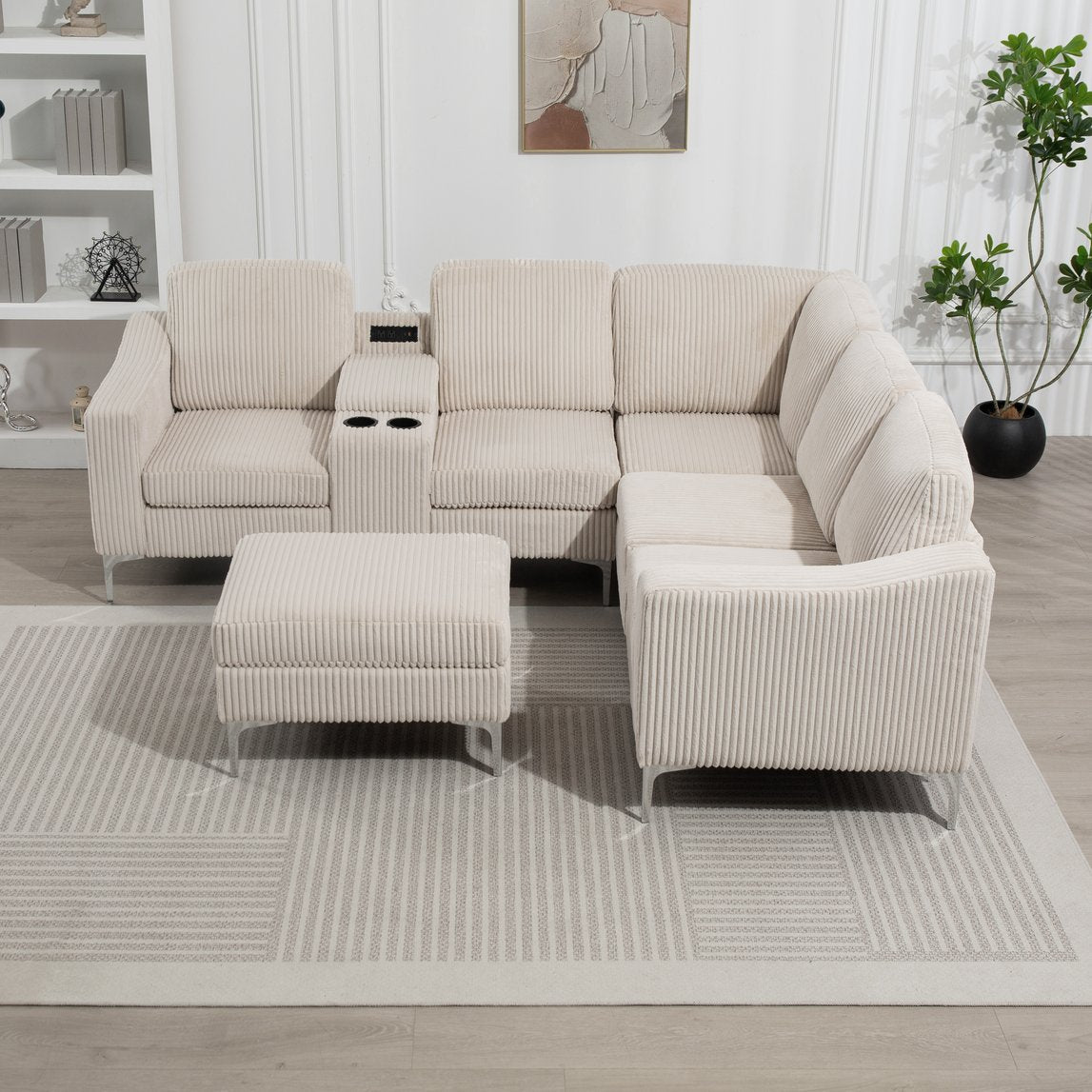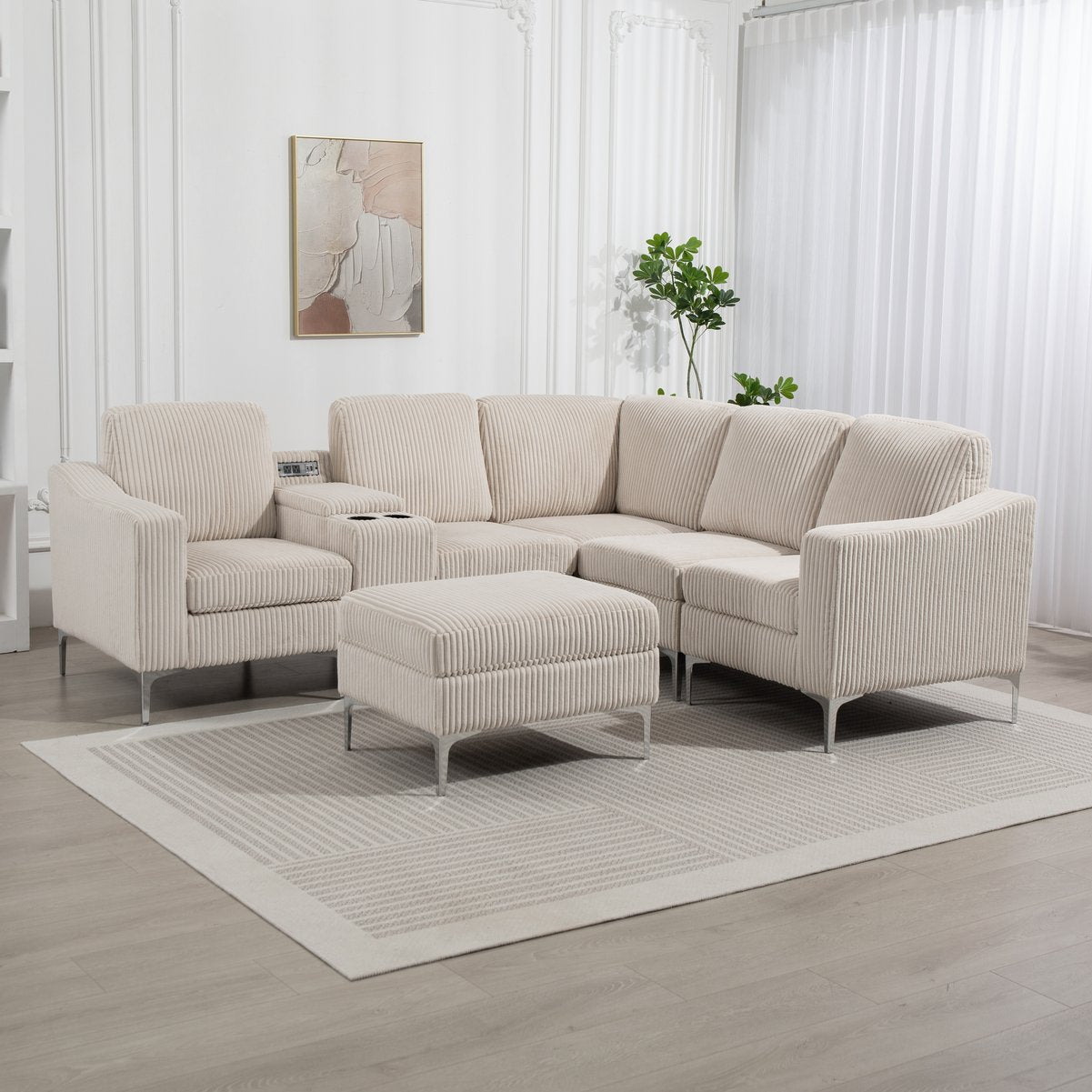 Create a cozy, versatile centerpiece for your living room or apartment with this convertible L-shaped sectional. Upholstered in soft corduroy, it combines durable construction, modular flexibility, and modern conveniences—like USB charging and cup holders—to adapt to lounging, entertaining, and everyday life with ease.