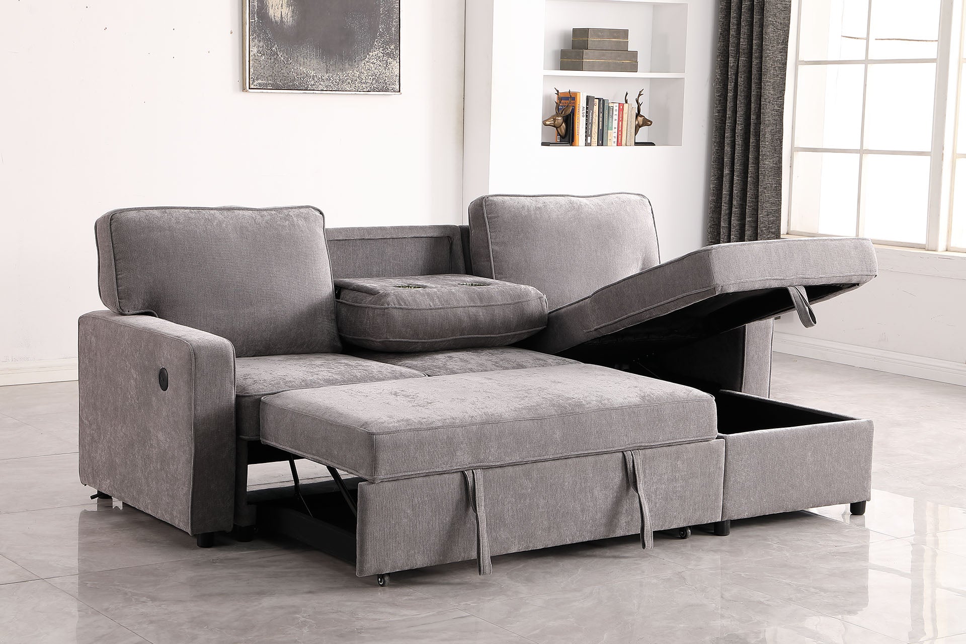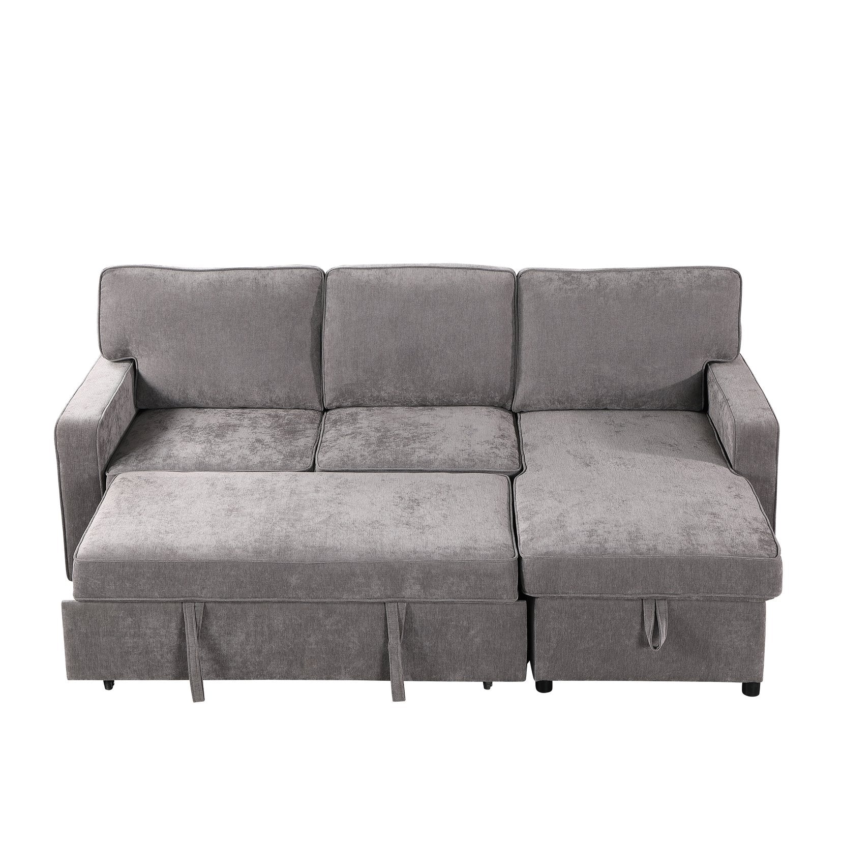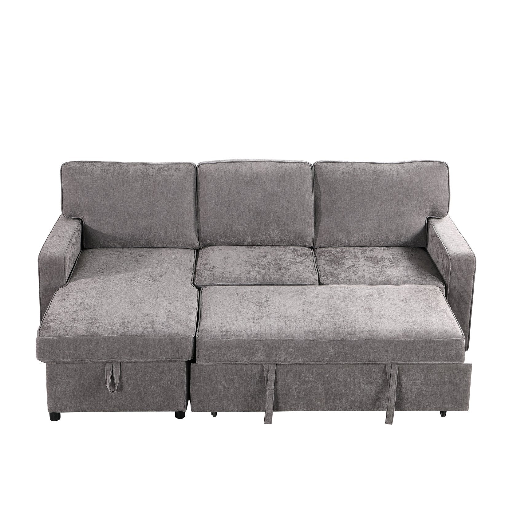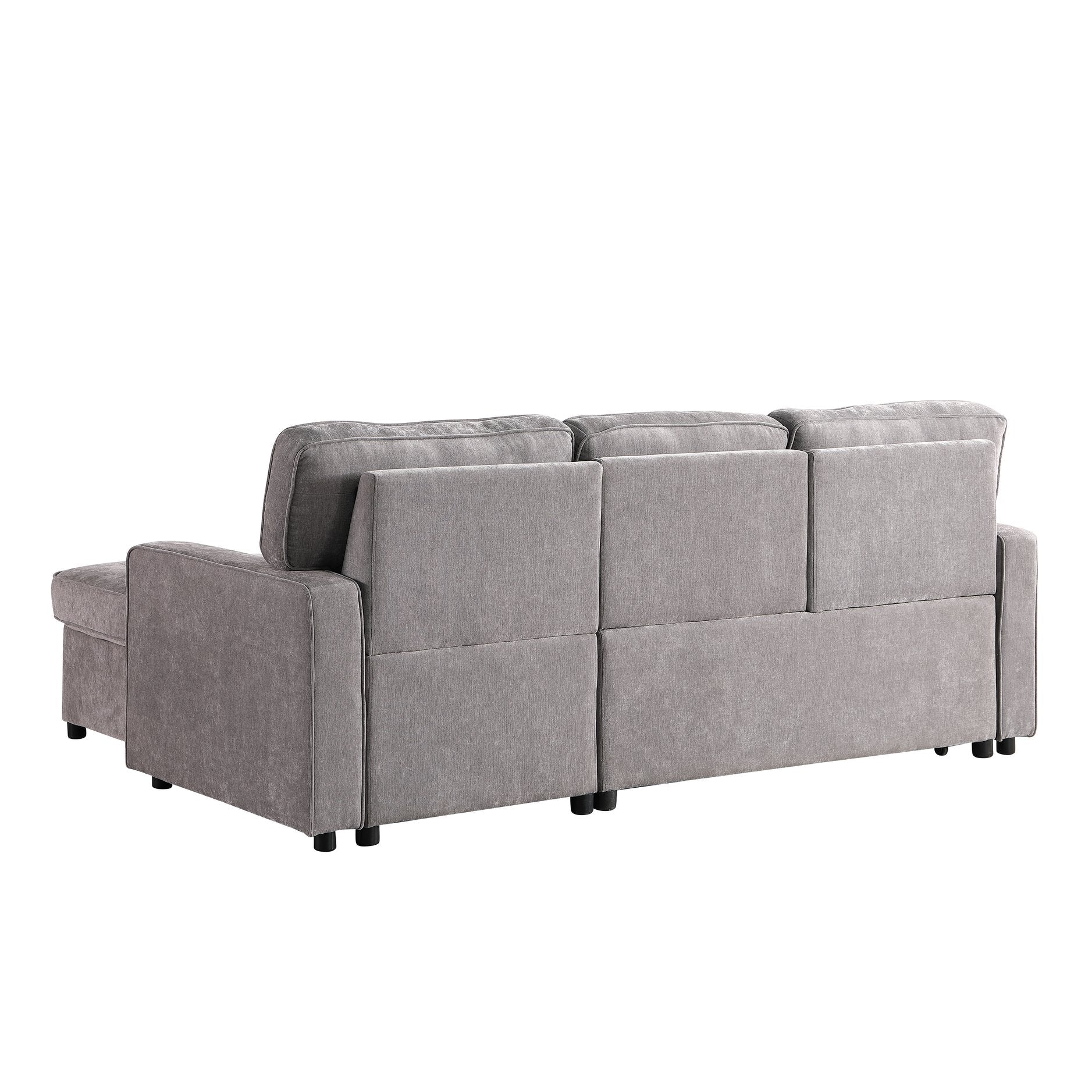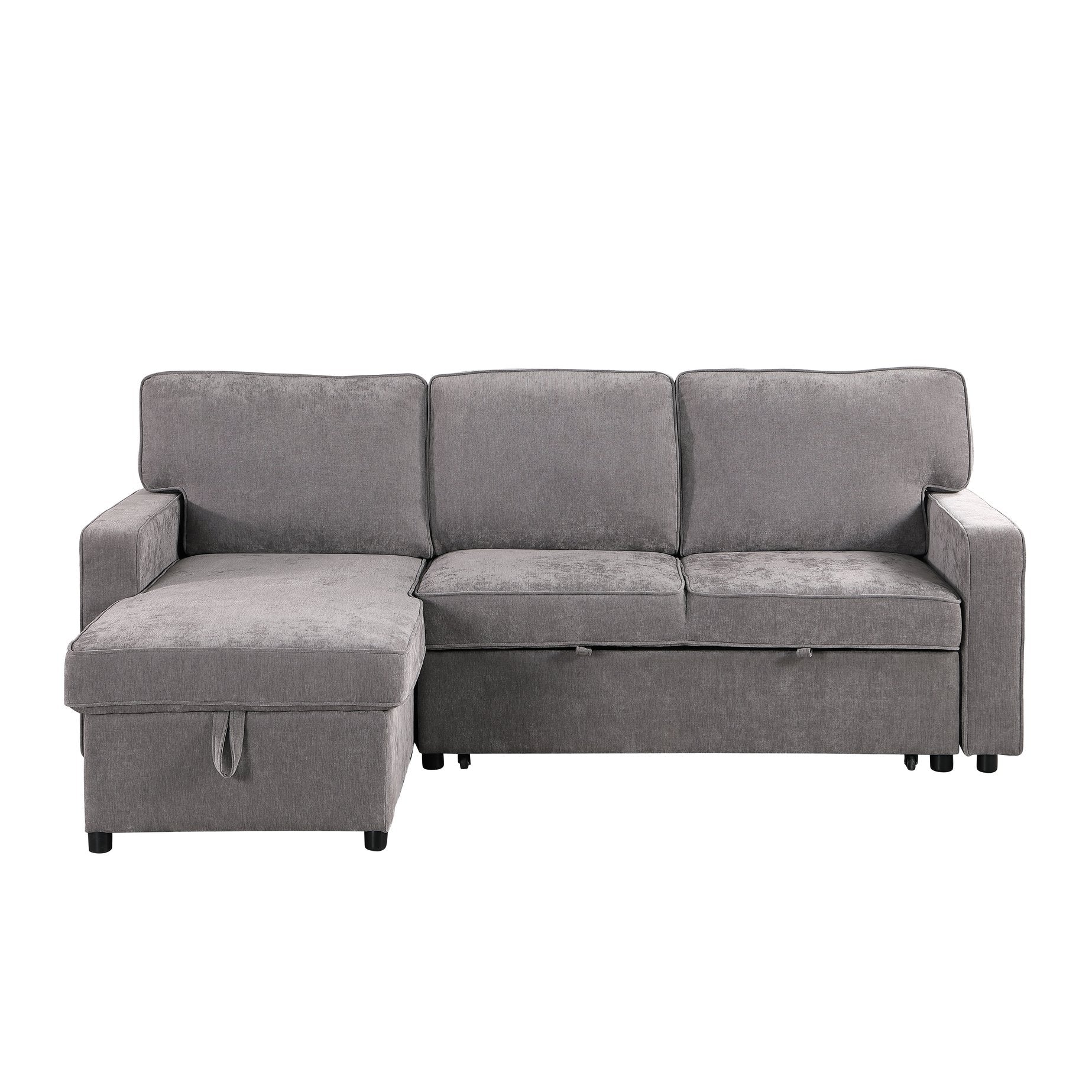 Turn your living room into a stylish, multi-functional retreat with this gray chenille sectional sleeper. Designed for everyday comfort and occasional overnight guests, it combines modern L-shaped styling with practical features—storage chaise, a pull-out bed, built-in cup holders and a USB charging port—so your space stays organized, comfortable, and ready for entertaining.