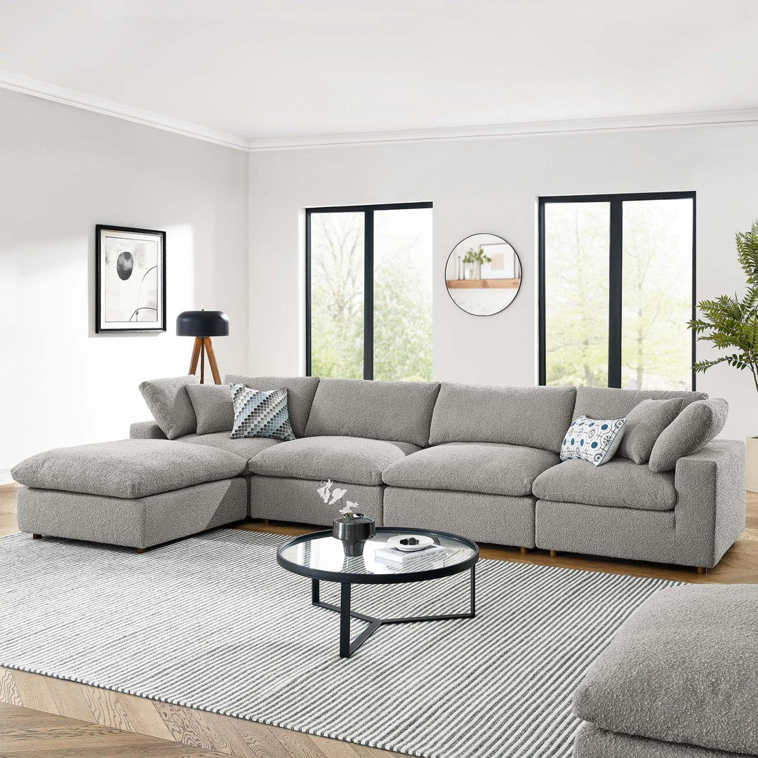 Sink into luxurious comfort with the Commix 5-piece overstuffed sectional — an inviting centerpiece that combines modern clean lines with sumptuous, down-filled relaxation. Wrapped in tactile boucle fabric with a charming nubby texture, this sectional is built on a solid wood frame and layered with foam and duck down cushions for a true “sit and stay” experience. Designed for sprawling out or cozying up, Commix elevates living rooms, family rooms, or game rooms with both style and comfort.