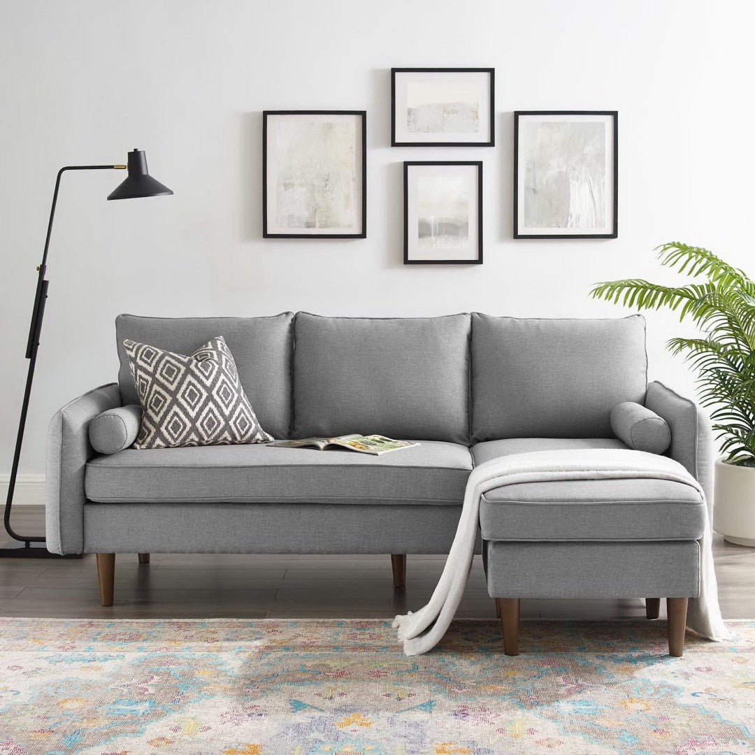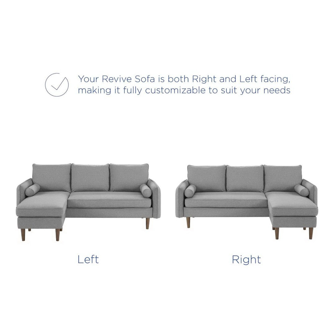 Refresh your living space with the Revive Upholstered Sectional — a versatile, modern three-seater available with a right- or left-facing chaise. Designed for everyday comfort and tailored style, this sectional combines dense foam, pocket coil support, and soft polyester upholstery for a plush yet supportive sit. Clean lines, tapered wood legs with non-marking foot caps, and included bolster pillows make it easy to integrate into a range of décor schemes while the built-in ottoman enables multiple lounging configurations.