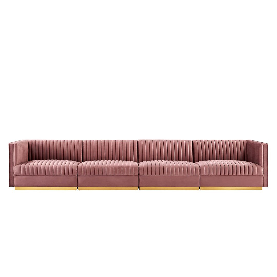 Elevate your living space with the Sanguine Channel Tufted Modular Sectional — a glamorous, retro-modern centerpiece that blends sumptuous comfort with durable, performance upholstery. Its vertical channel tufting and gold stainless-steel base deliver a refined, sculptural silhouette while resilient construction and modular connectors let you configure seating to suit living rooms, lounges, or home offices. Luxurious yet practical, this sectional resists stains and protects floors with non-marking pads, making it as functional as it is striking.