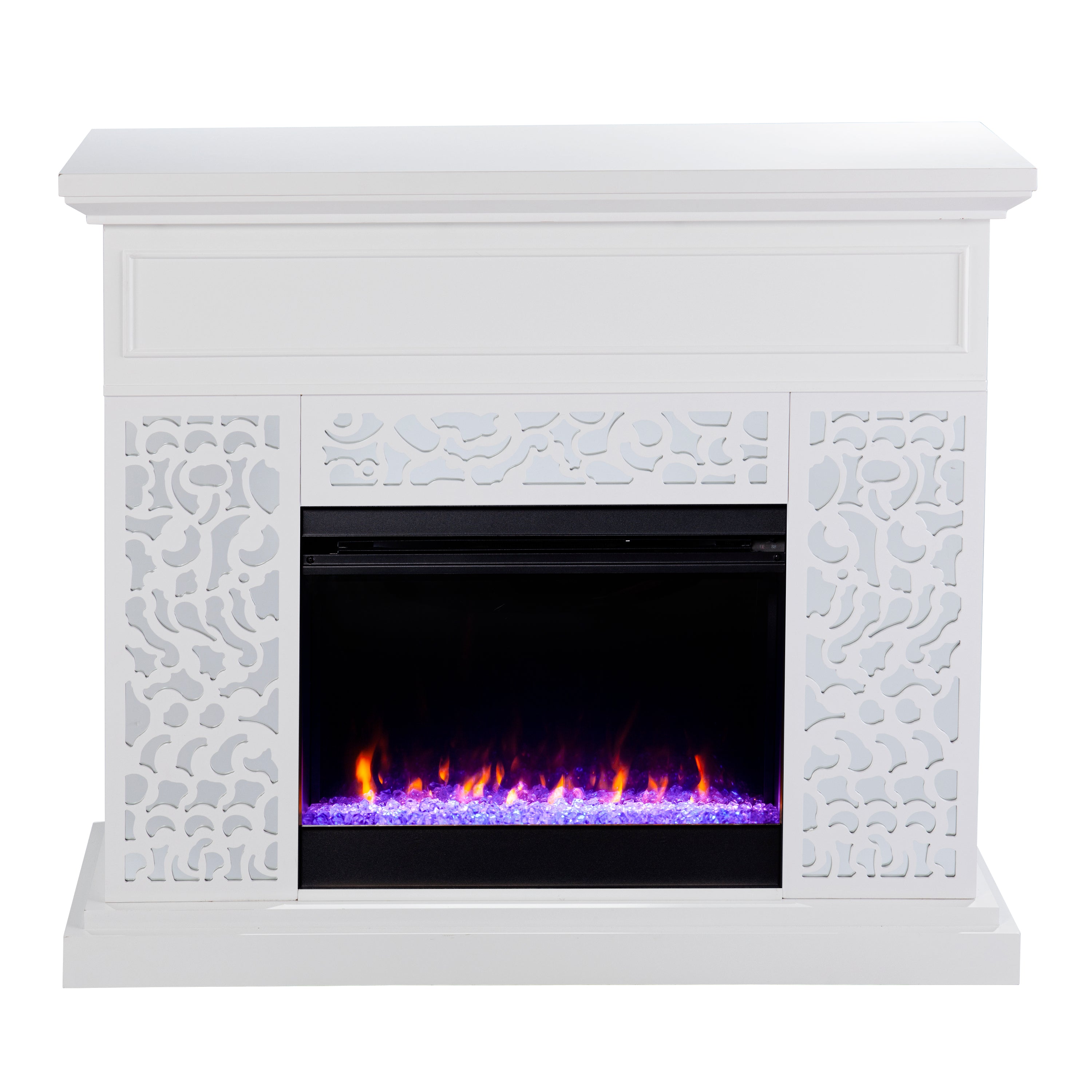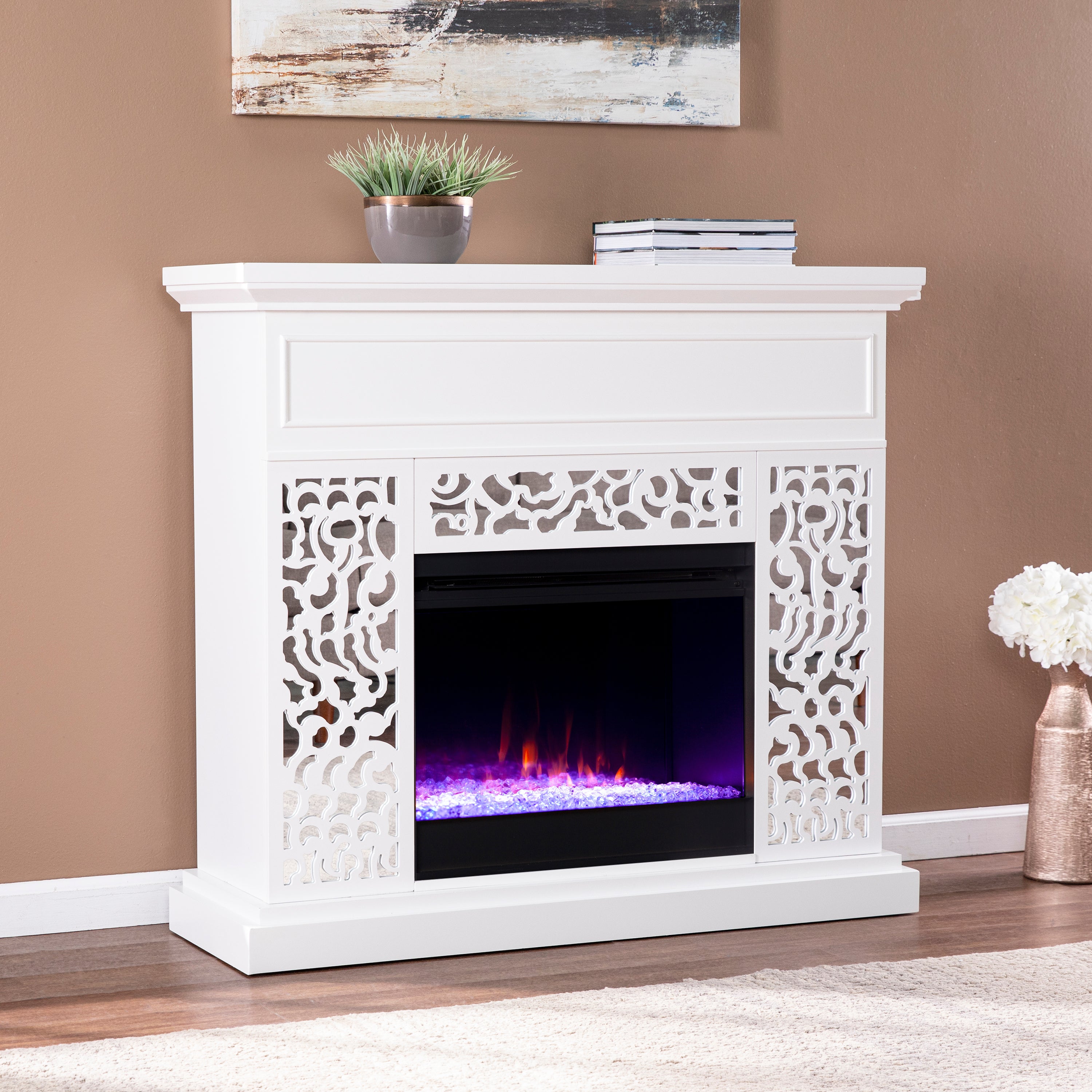 - Feature 1: Modern electric fireplace w/ mirror accents