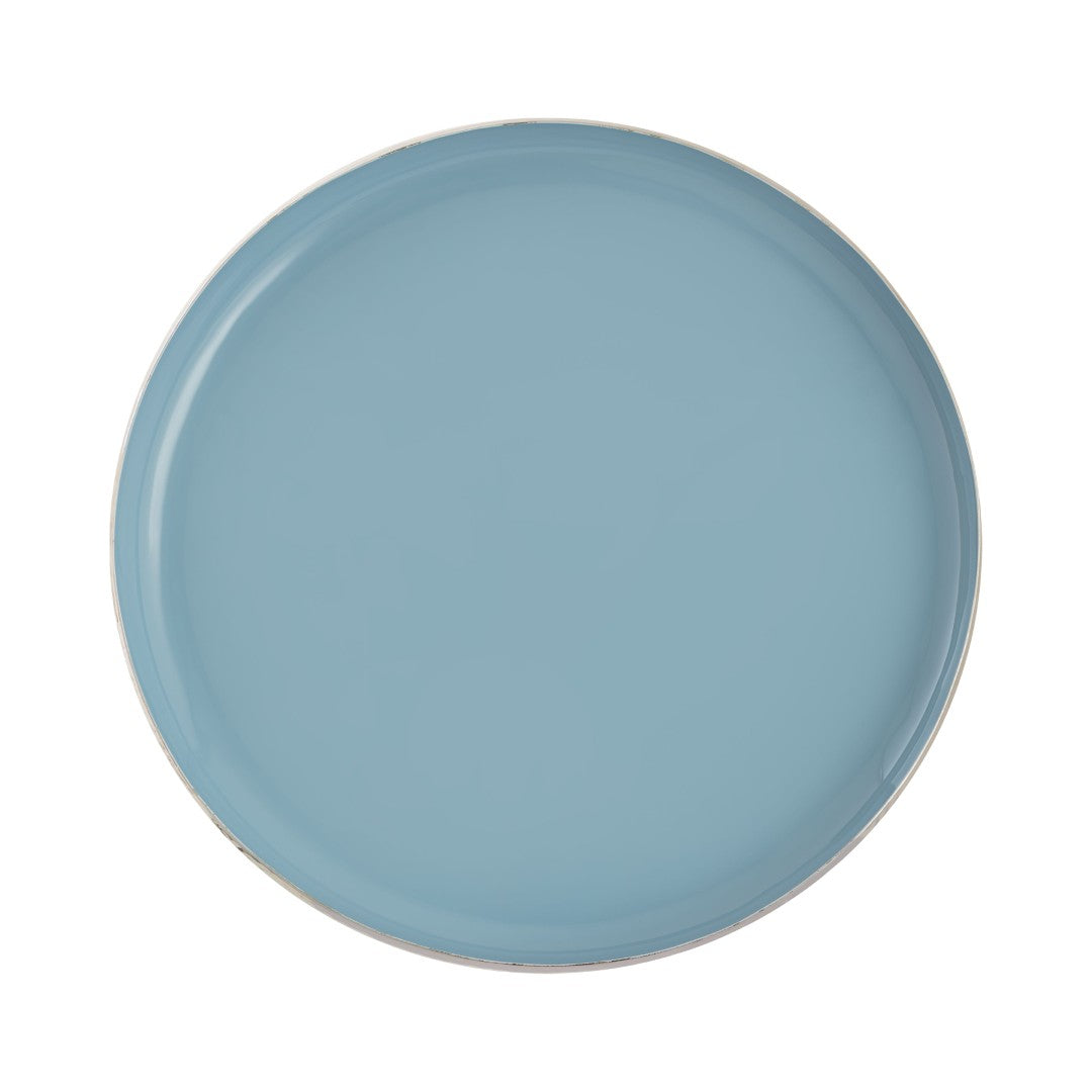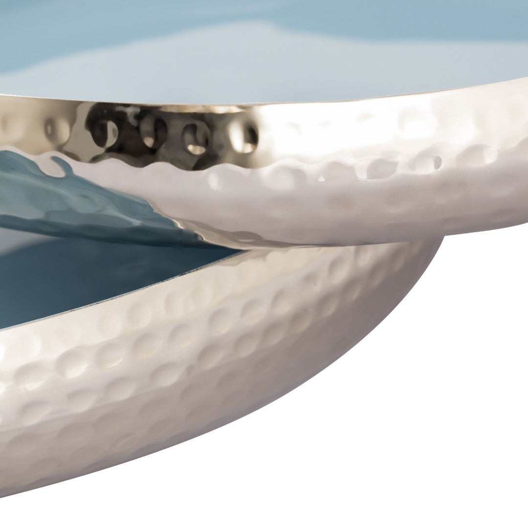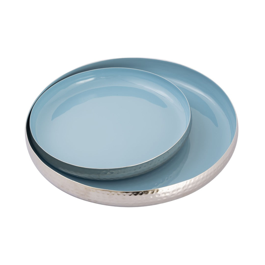 Elevate your tabletop and organize with understated elegance using this set of two nesting Nelson trays. Crafted from durable metal with a refined hammered exterior and serene light blue enamel interiors, the trays combine sculptural texture with practical design—perfect for serving, displaying decorative accents, or corralling everyday essentials while adding a touch of modern vintage charm.