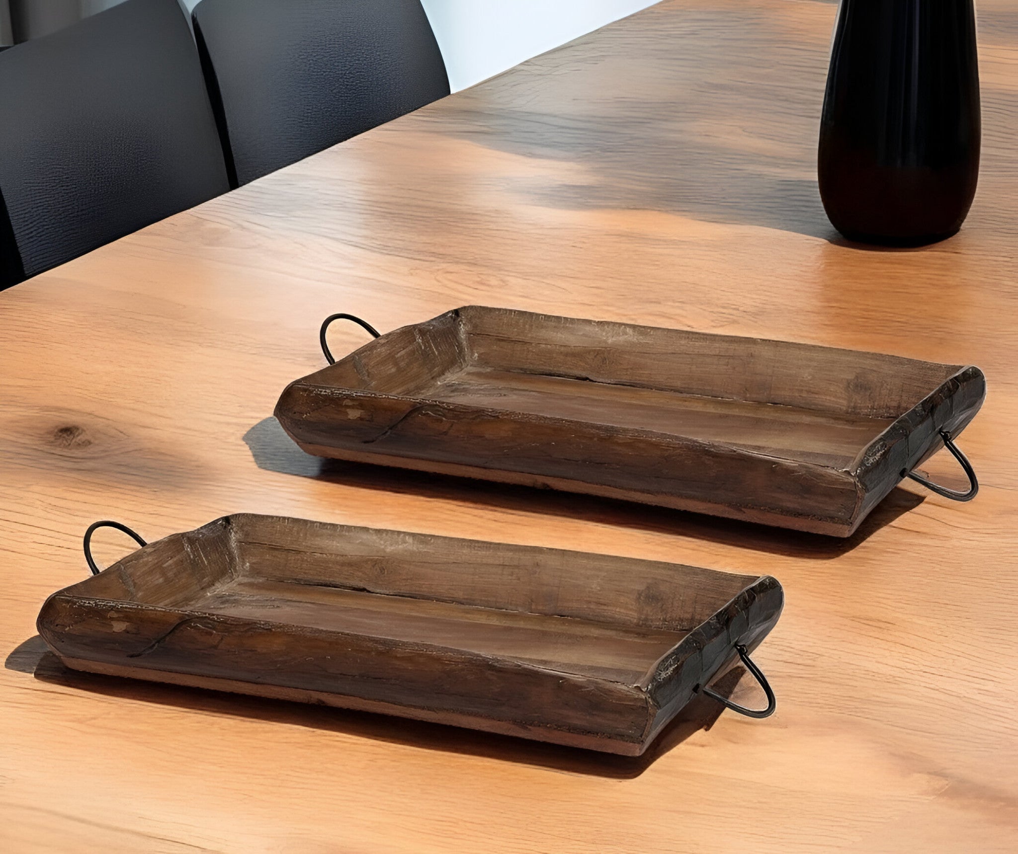 - Made from durable and eco-friendly recycled wood, a set of two, rectangular trays finished in a medium-brown polish that highlights the grain and character of the wood