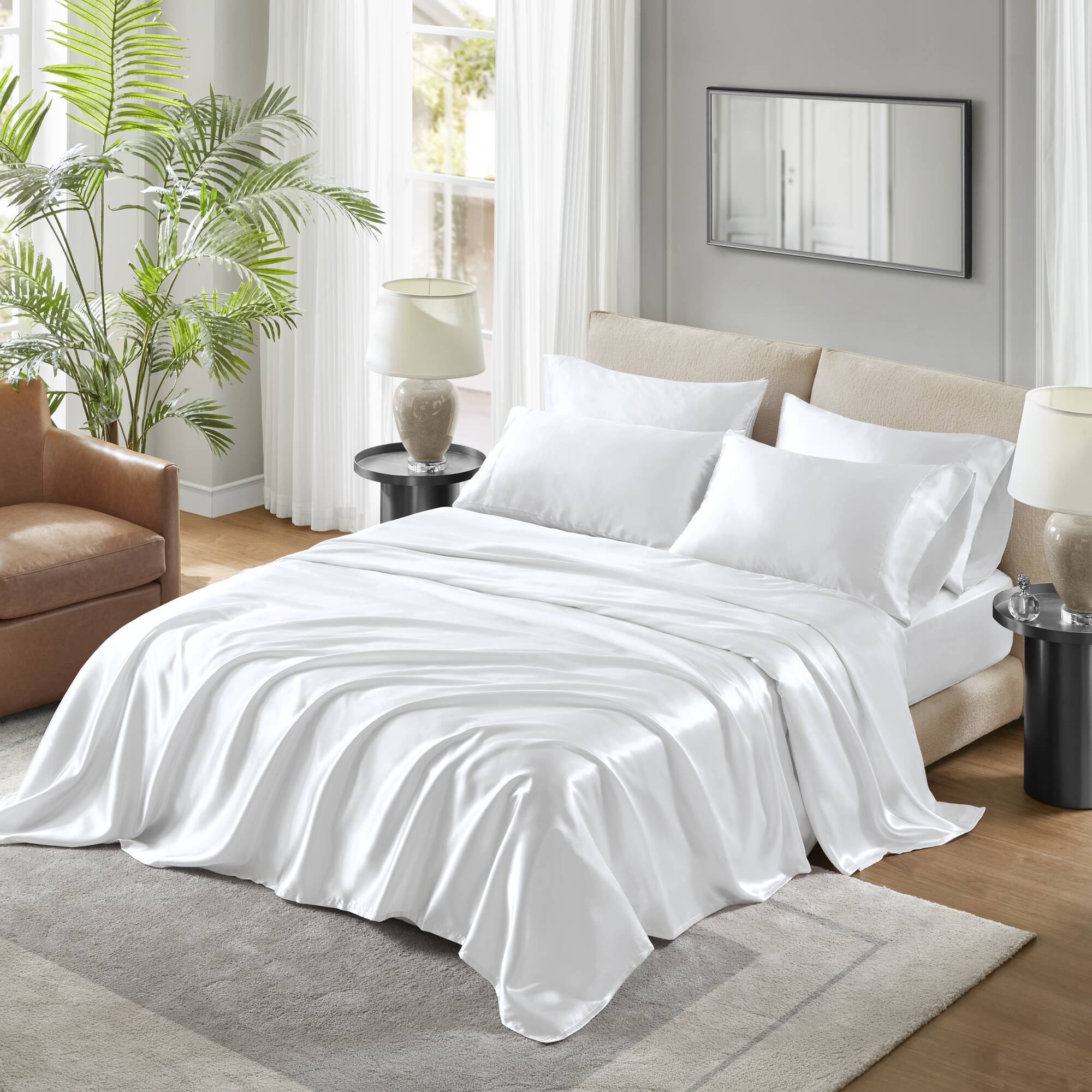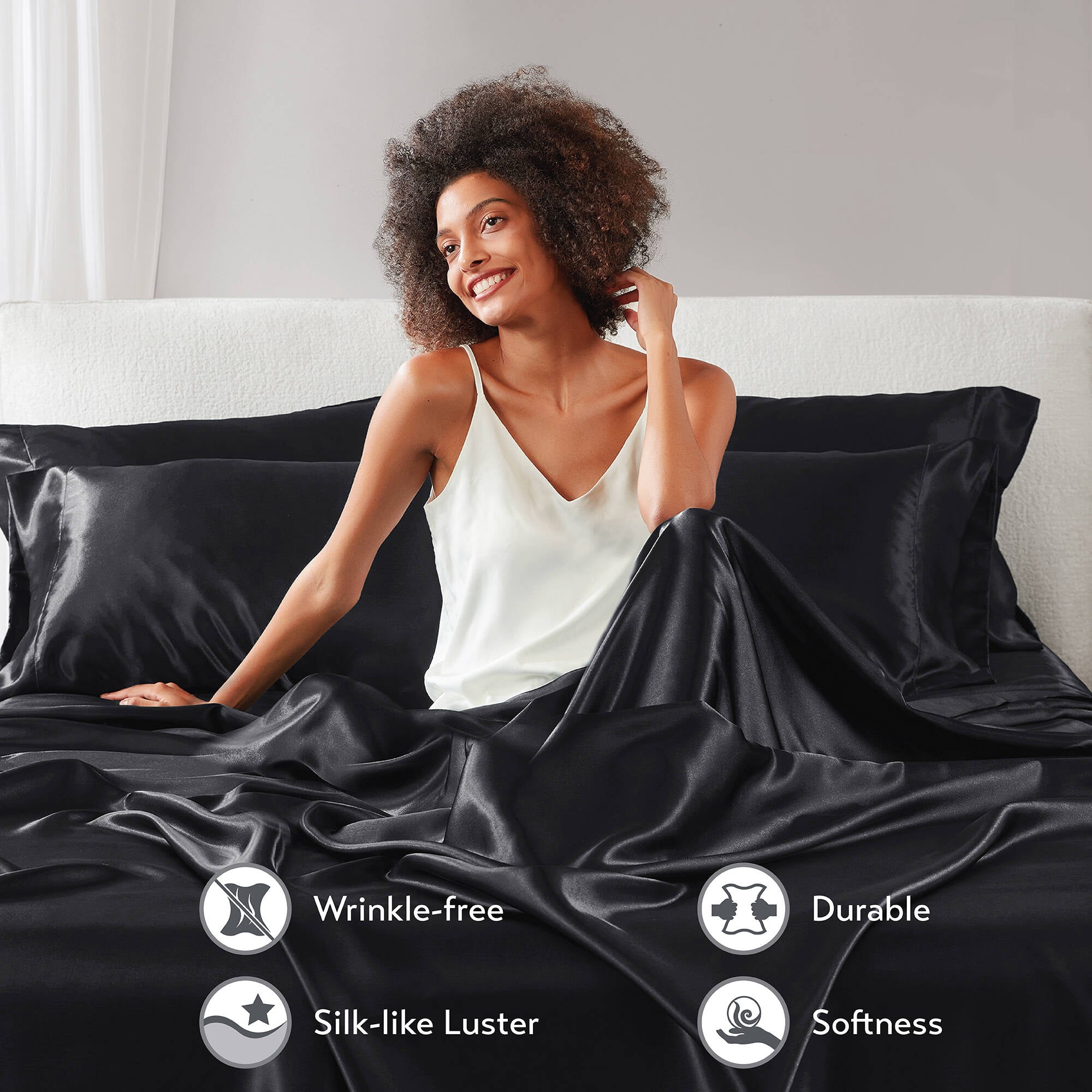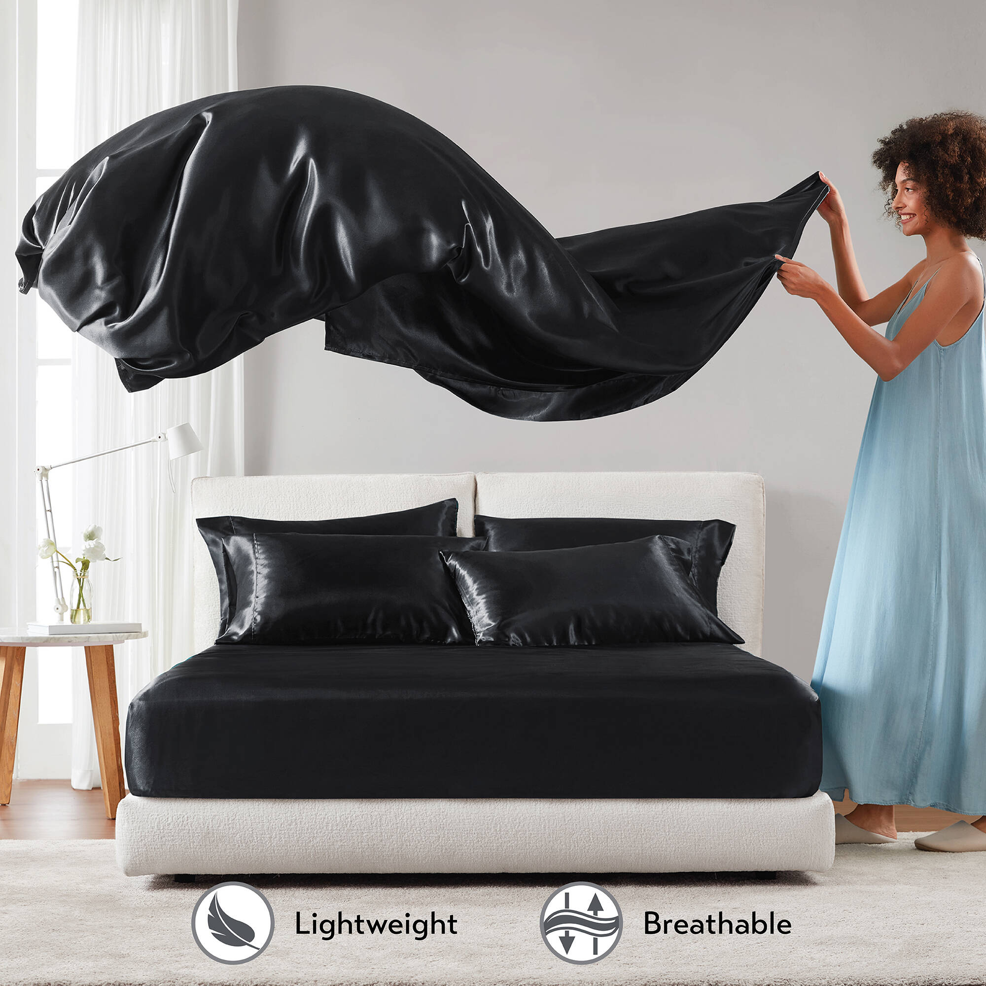 Transform your bedroom into a sleek, hotel-quality retreat with this 4-piece Twin luxury sheet set in elegant black. Crafted from smooth satin polyester for a lustrous finish and durable comfort, this complete set delivers a polished look and easy care—perfect for everyday use or special occasions.