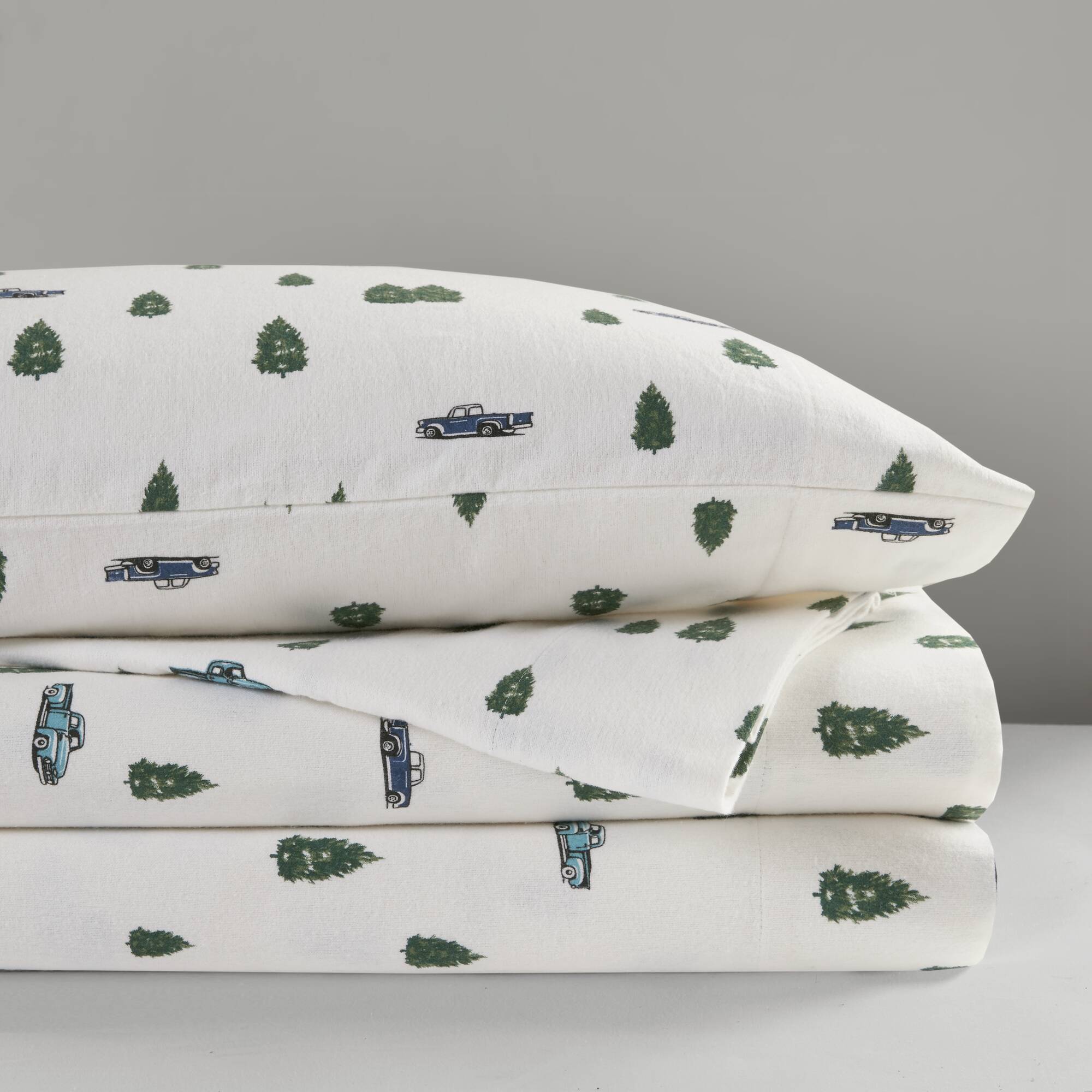 Cozy up your California King bed with this charming 4-piece flannel sheet set featuring a playful green trees and trucks pattern—perfect for colder nights. Made from 100% cotton flannel, this set delivers soft, breathable warmth and durable construction for long-lasting comfort and easy care.