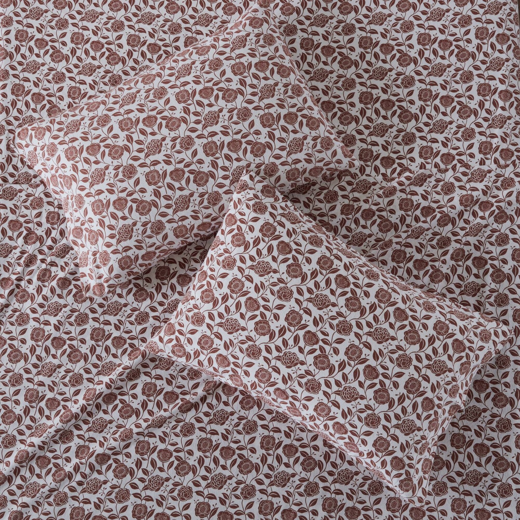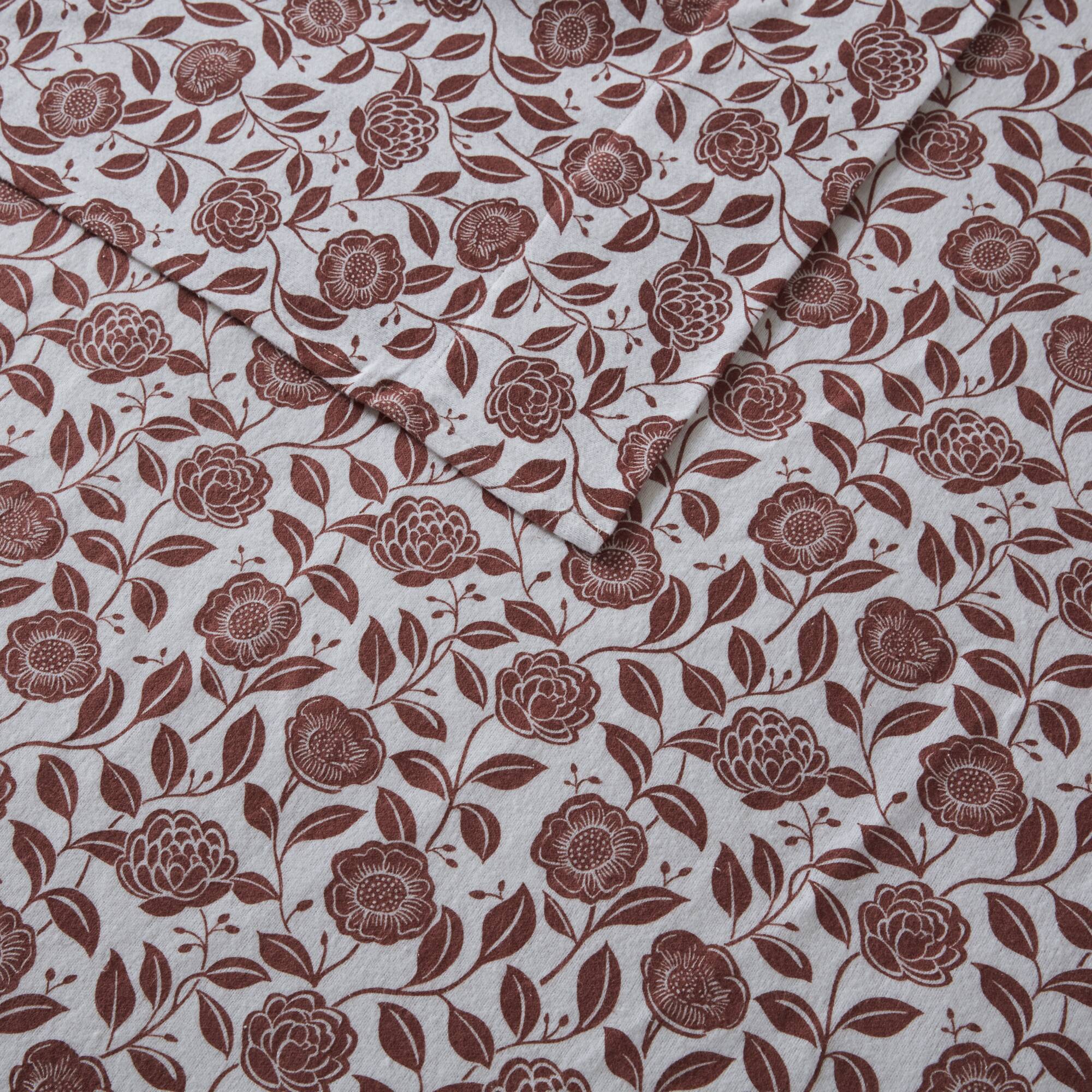Transform your bedroom into a cozy, inviting retreat with this 4-piece queen sheet set in a warm rust floral pattern. Crafted from 100% cotton flannel, the set provides a soft, breathable, and insulating sleep surface ideal for cooler nights. Thoughtful construction details—like a fully elasticized fitted sheet and reinforced 4" self-hem stitching on the flat sheet and pillowcases—ensure a snug fit and lasting durability while the classic floral design adds subtle, timeless charm.