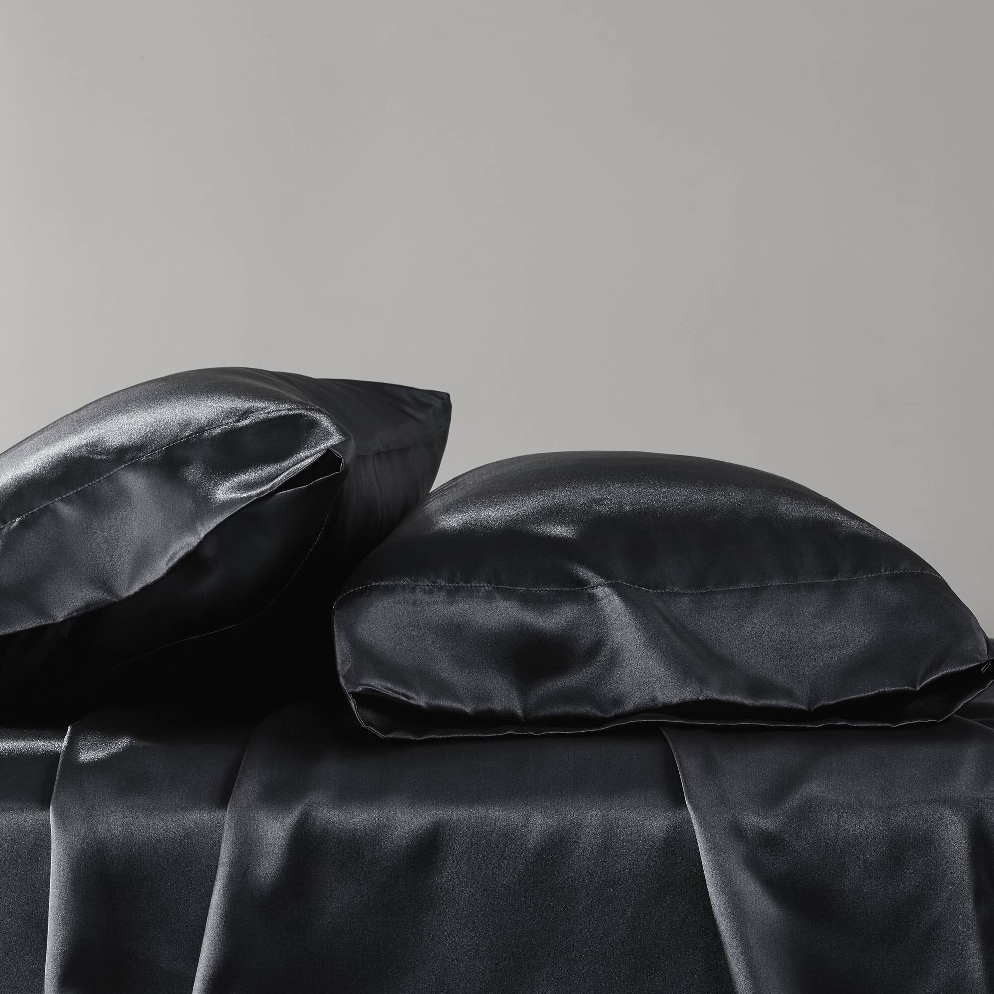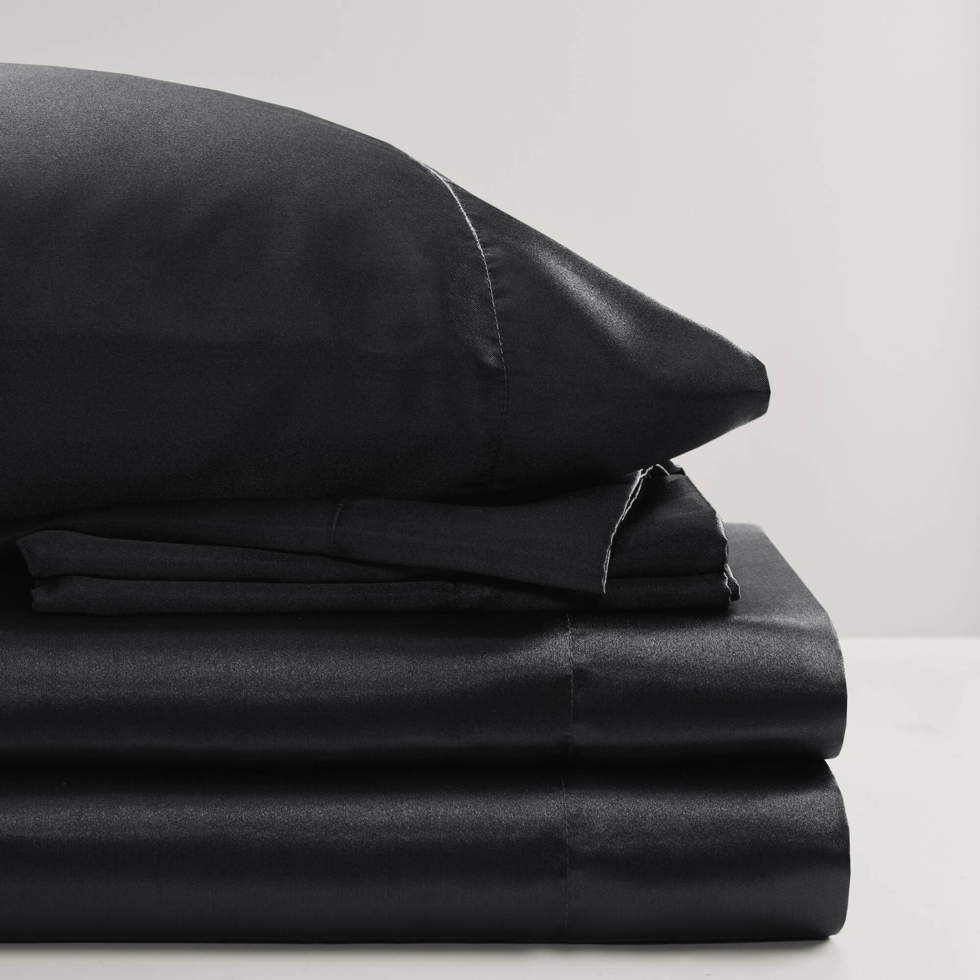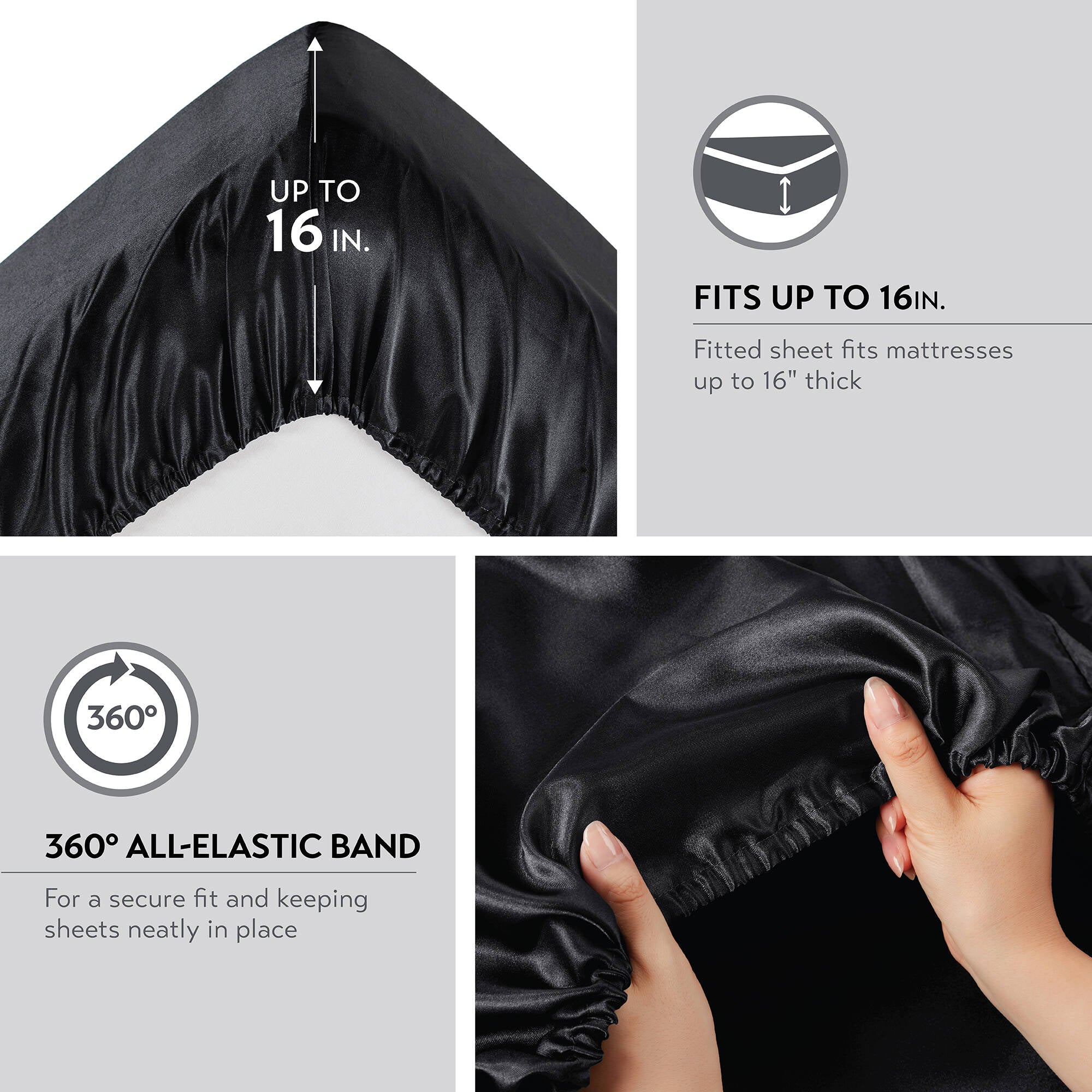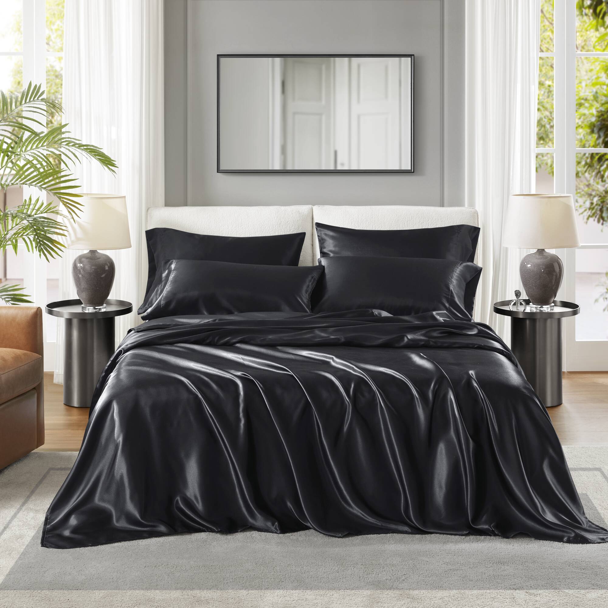 Elevate your bedroom with this luxurious 7-piece Split King sheet set in sleek black, designed for comfort, durability, and a smooth satin finish that adds a touch of hotel-quality elegance to your sleep space. Crafted from easy-care polyester satin, this coordinated set provides a tailored fit for split king mattresses while delivering a soft, lustrous feel and lasting color.
