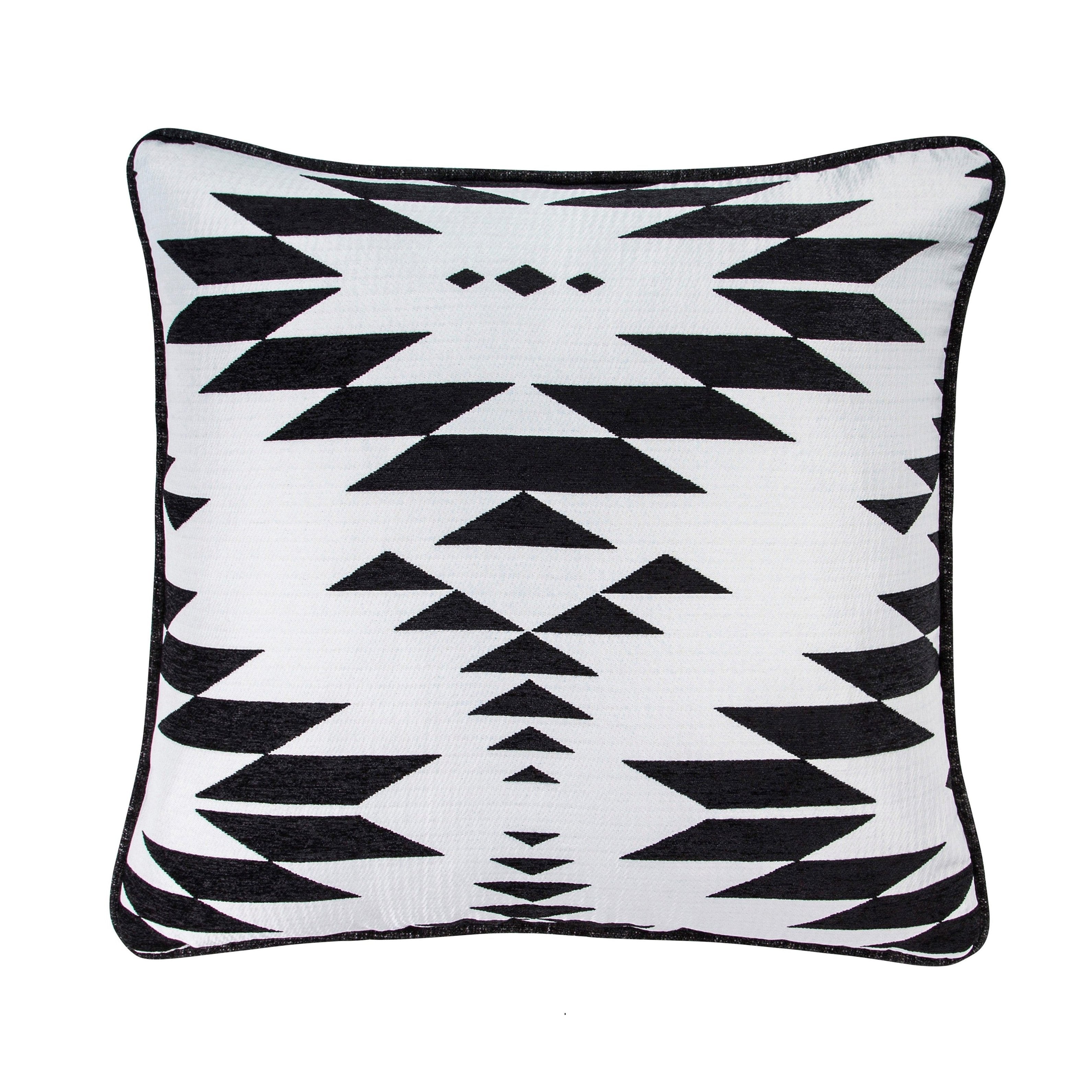 Elevate your bedroom décor with the Amelia Black & White Aztec Jacquard Euro Sham, a striking piece that beautifully blends modern design with traditional Aztec motifs. This Euro sham features a stunning geometric jacquard pattern that not only adds visual interest but also creates a sense of harmony and sophistication in any setting. Its bold black and white color scheme makes it a versatile addition, seamlessly complementing a variety of interior styles, particularly in a contemporary Southwestern theme. Pair it with other coordinating shams and pillows from the Amelia collection to complete your chic and inviting bedroom oasis.