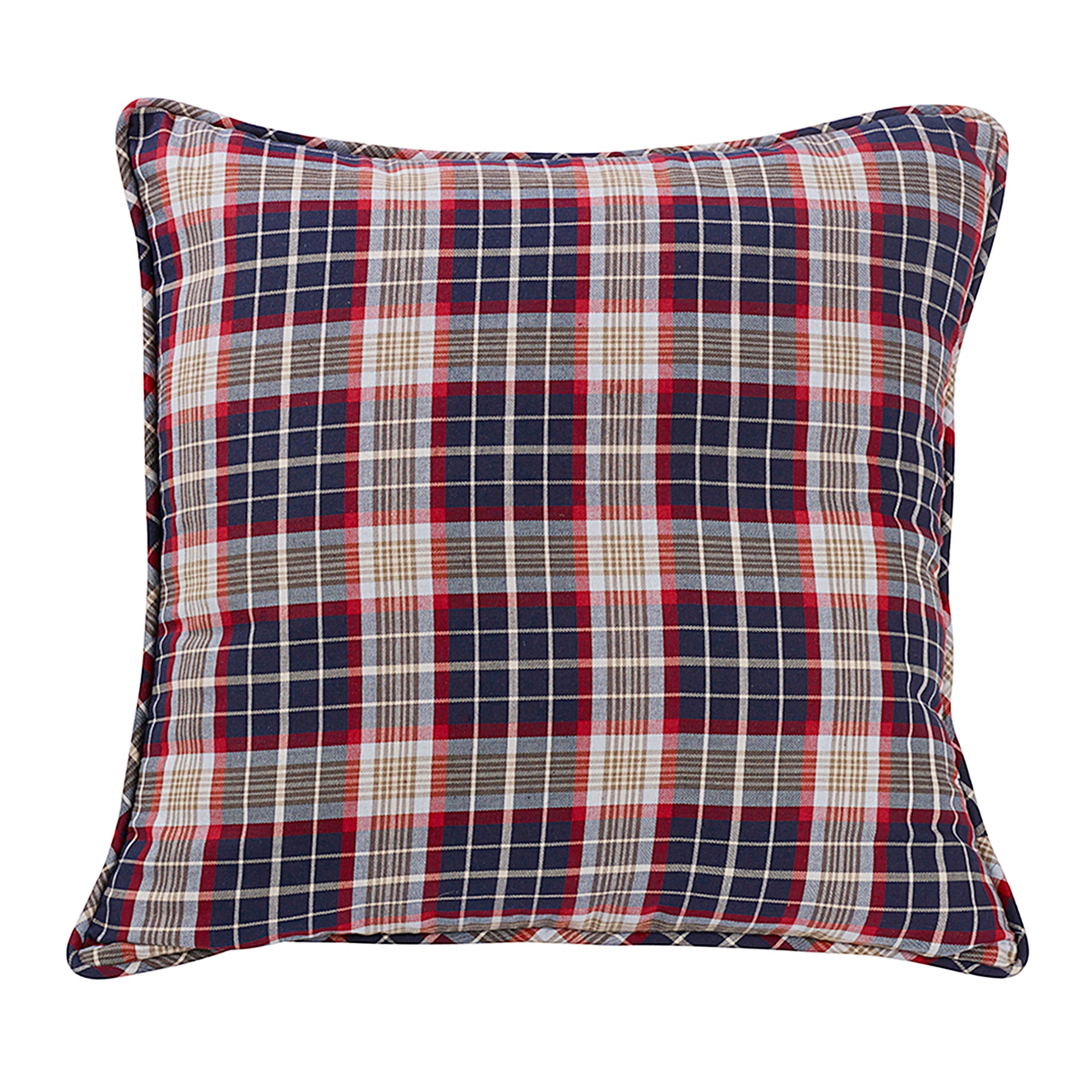Elevate your home decor with our Blue Plaid Euro Sham, a stunning addition to the South Haven collection. This expertly crafted sham features a striking red, tan, and navy plaid design on the front, complemented by a sophisticated red and tan windowpane pattern on the reverse. Perfect for adding a touch of rustic charm to your lake home or any living space, this euro sham combines style and functionality effortlessly. Its generous size and hidden zipper closure ensure a polished look, while the durable fabric promises long-lasting beauty and comfort.