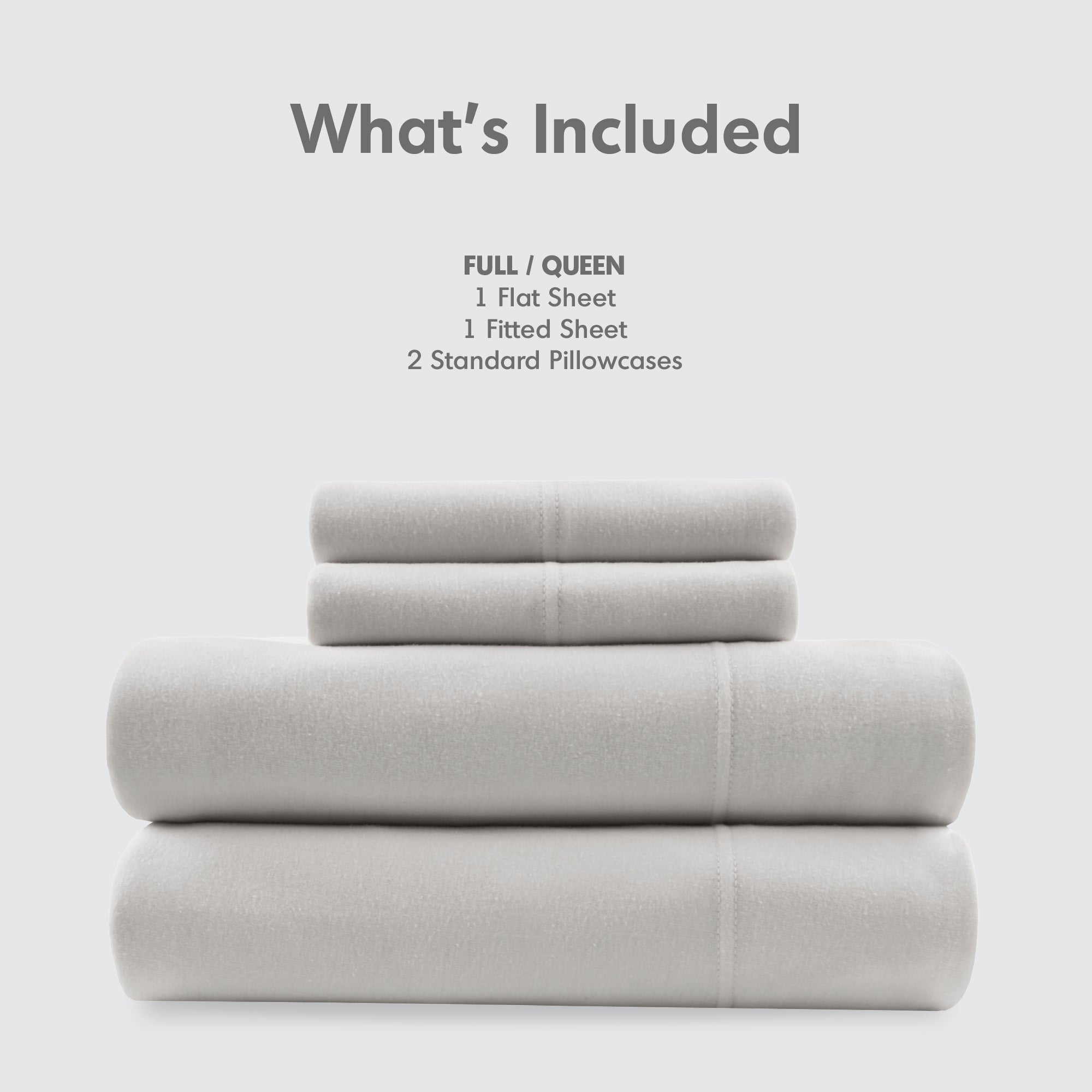 Experience the soft, breathable comfort of a sheet set that feels like your favorite tee—designed to perform year-round. This jersey knit cotton blend adapts to changing temperatures, staying cozy in cooler months and breathable when it’s warm. Thoughtfully constructed for easy bed-making and low-maintenance care, it brings everyday comfort and a clean, modern look to any bedroom.