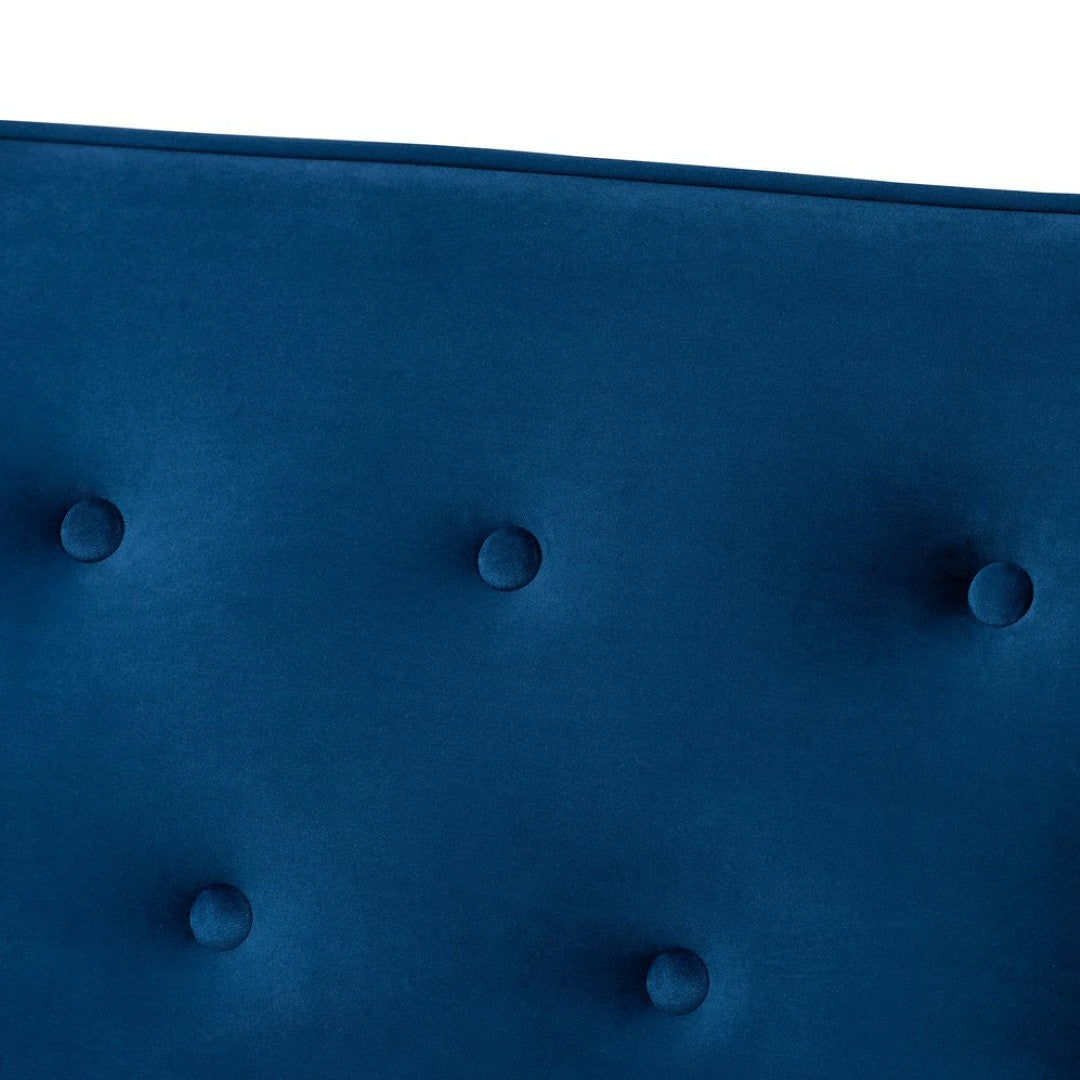 - Finish: Navy blue velvet fabric upholstery with dark walnut wood accents.