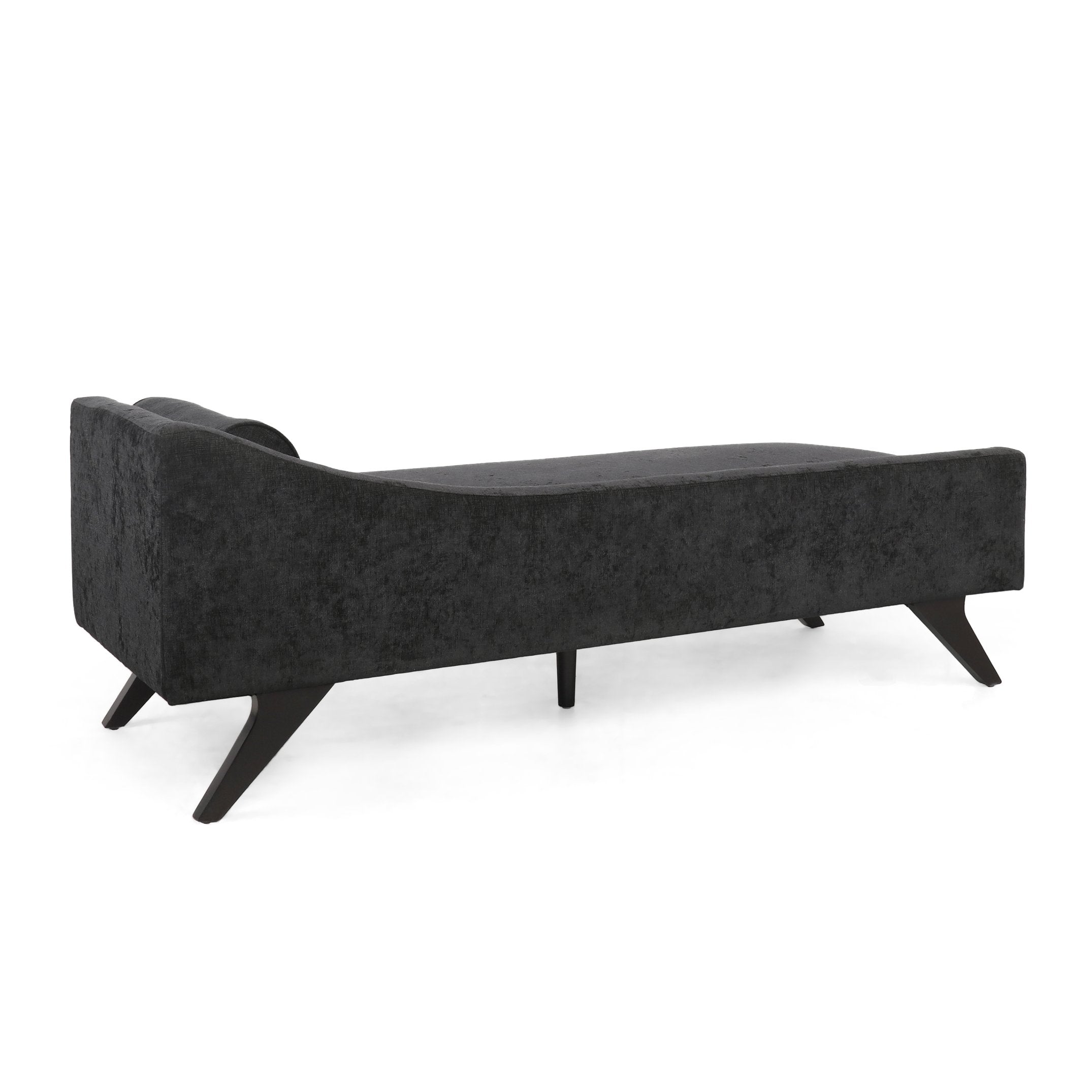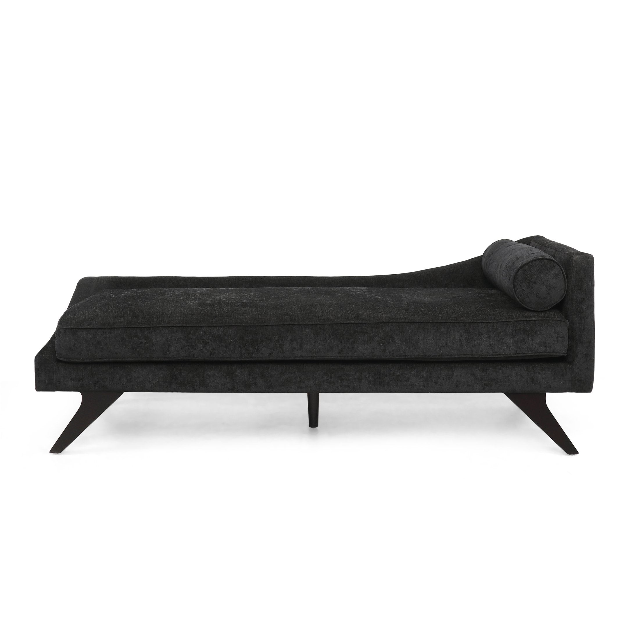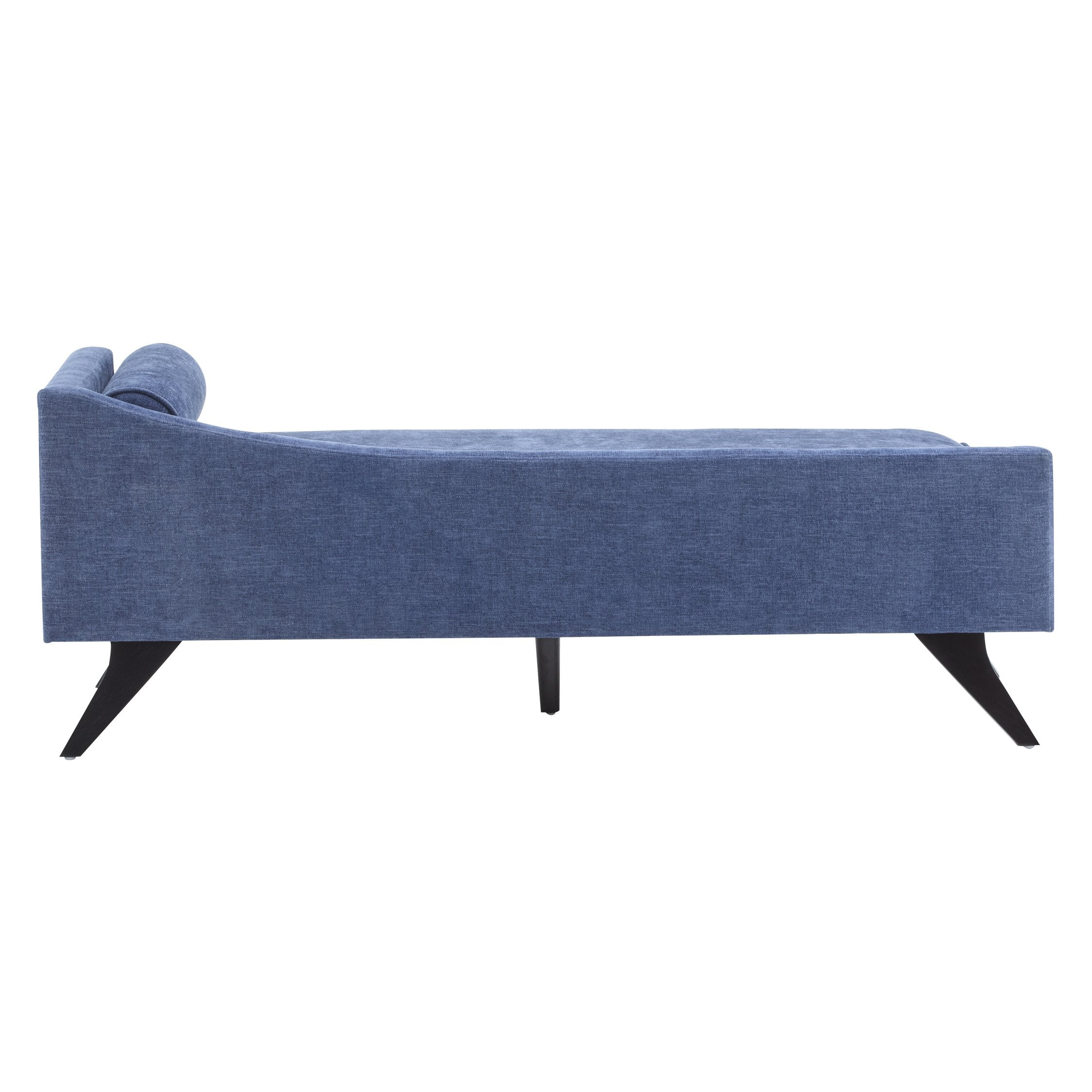 - Find style and leisure in the form of a beautifully designed chaise lounge that boasts refinement in any home. Featuring smooth upholstery and iconic splayed legs, this chaise lounge offers a luxurious space in your living room for all to enjoy. Our chaise lounge is finished with a lovely rolled accent pillow that perfectly matches its sloped frame, making this both a sophisticated and enjoyable addition. Perfectly balancing comfort and style, this chaise lounge invites you to upgrade your inter