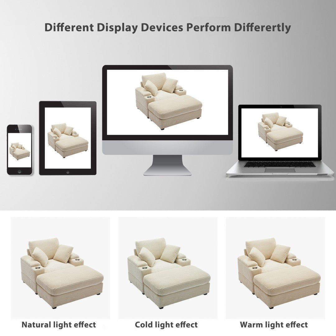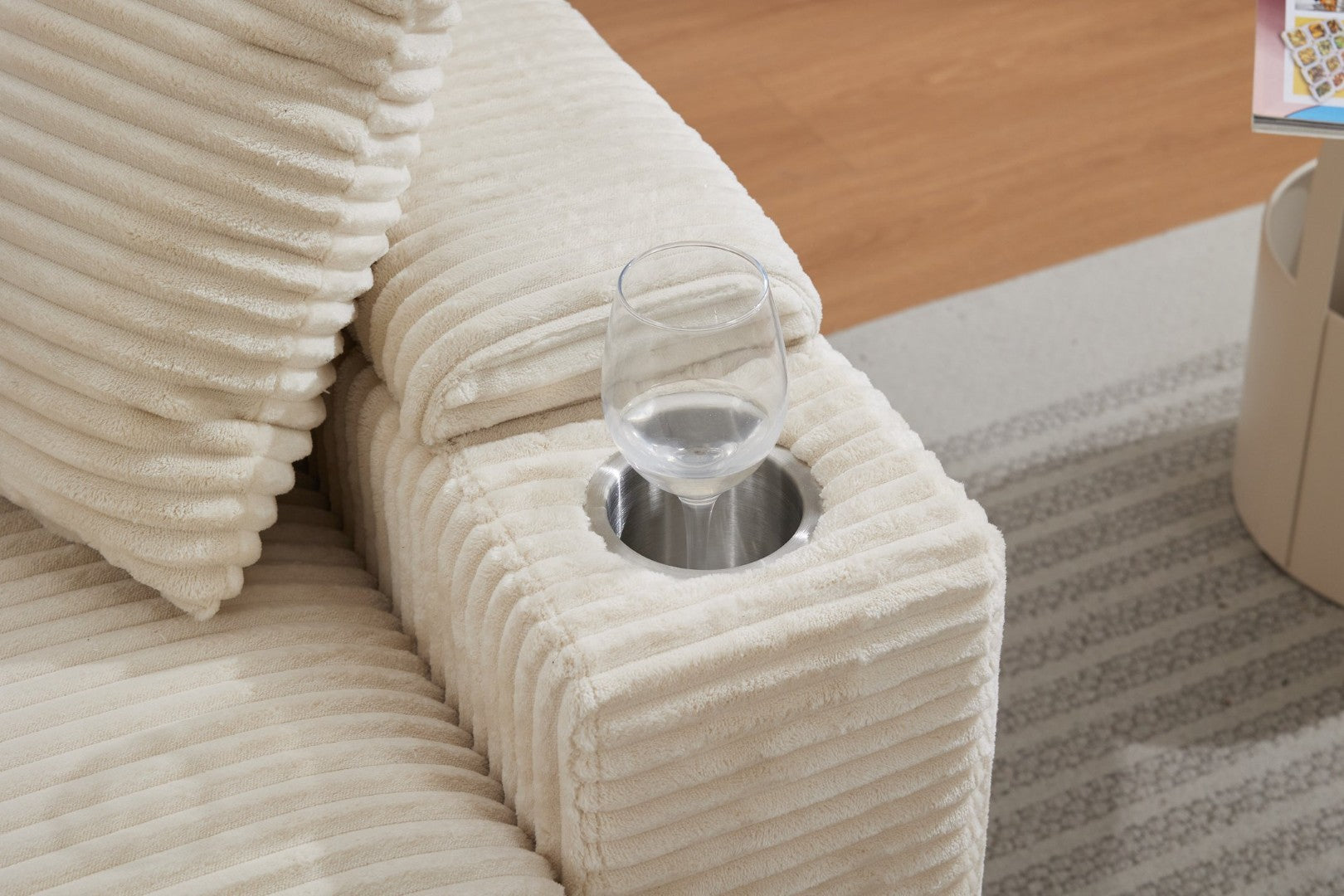 Bring a blend of vintage texture and modern convenience to your living room or office with this corduroy-upholstered chaise lounge. Designed for deep, supportive seating and thoughtful storage, it pairs a soft wide-stripe corduroy finish with practical features like stainless-steel cupholders, armrest storage with silent rebound, and a movable ottoman for adaptable lounging. Durable construction and detachable cushions make maintenance easy while the generous seat and back support ensure lasting comfort.