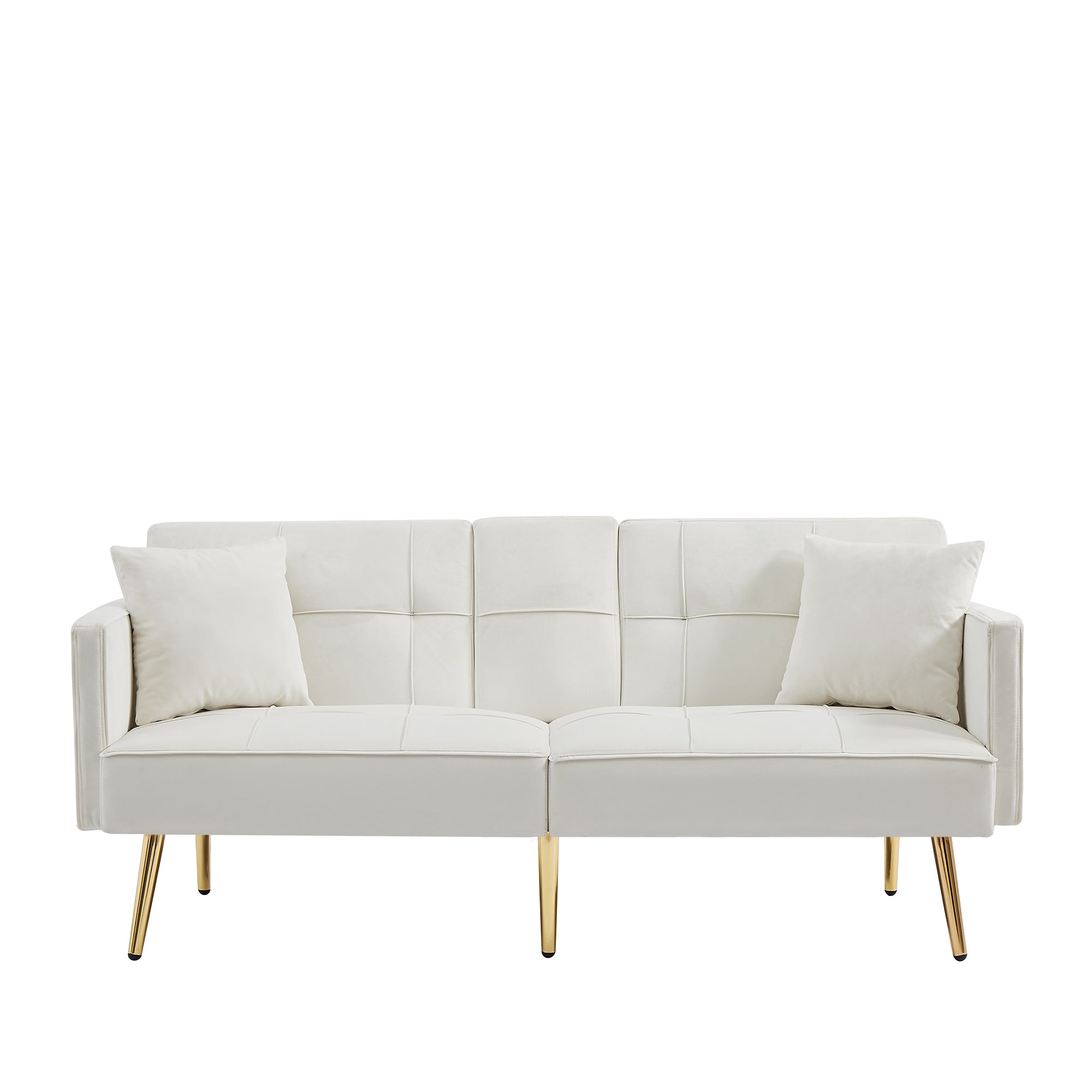 This cream white velvet futon sofa bed blends modern elegance with practical functionality — a versatile piece that elevates your living space while delivering comfortable seating and a convenient sleeping solution. Plush velvet upholstery, chic gold metal legs, and clever built-in features make it perfect for apartments, guest rooms, or multi-use living areas.