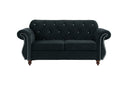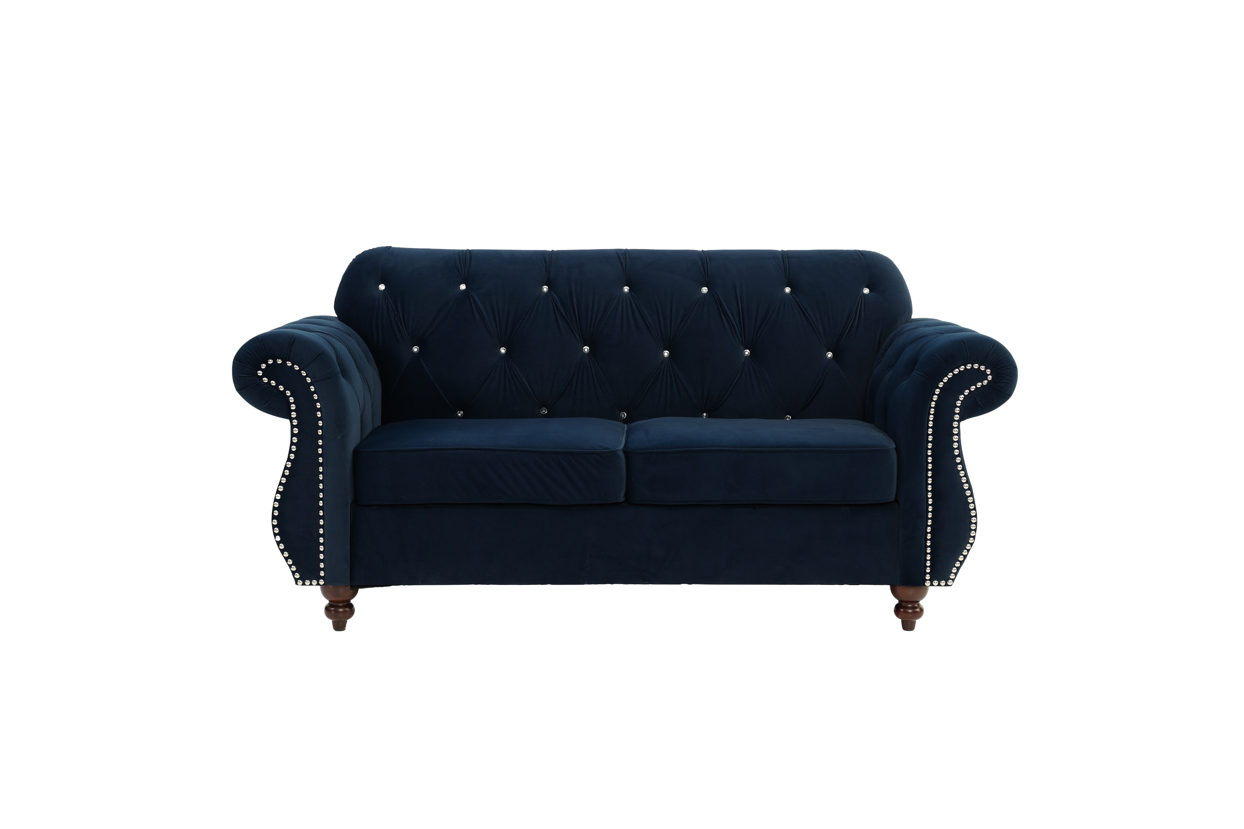 Elevate your living space with this elegant indigo velvet loveseat that blends classic charm and modern detailing. Perfect for intimate seating in a living room, den, or formal parlor, its rolled arms, low tufted back, and silver nailhead trim create a refined focal point while plush cushions ensure lasting comfort. Available in Indigo and Black, this two-seat piece pairs beautifully with coordinating sofa and chair options (sold separately).