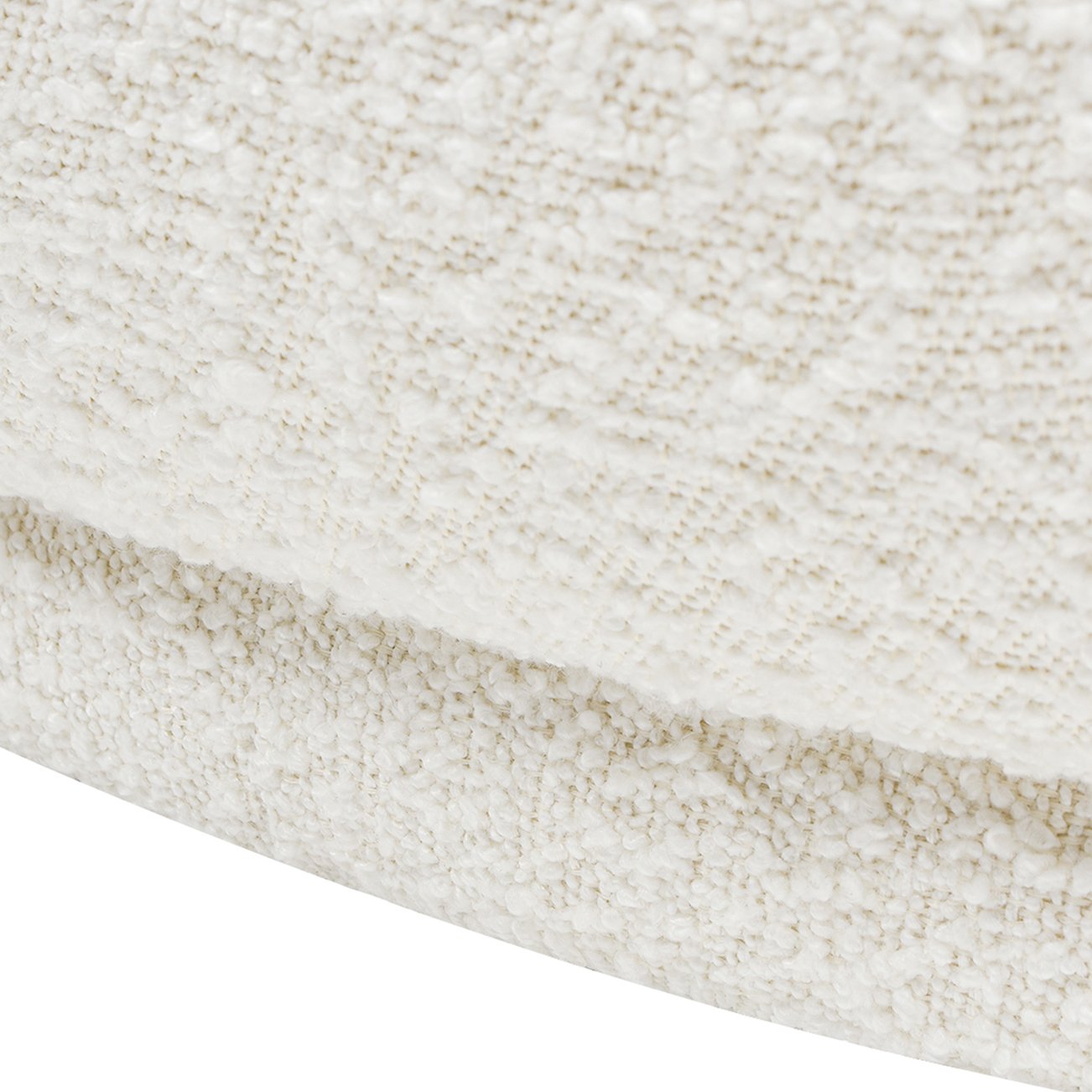 - Upholstery: Ivory white boucle faux-sheepskin with intricately looped yarns for a soft, tactile surface and visual depth