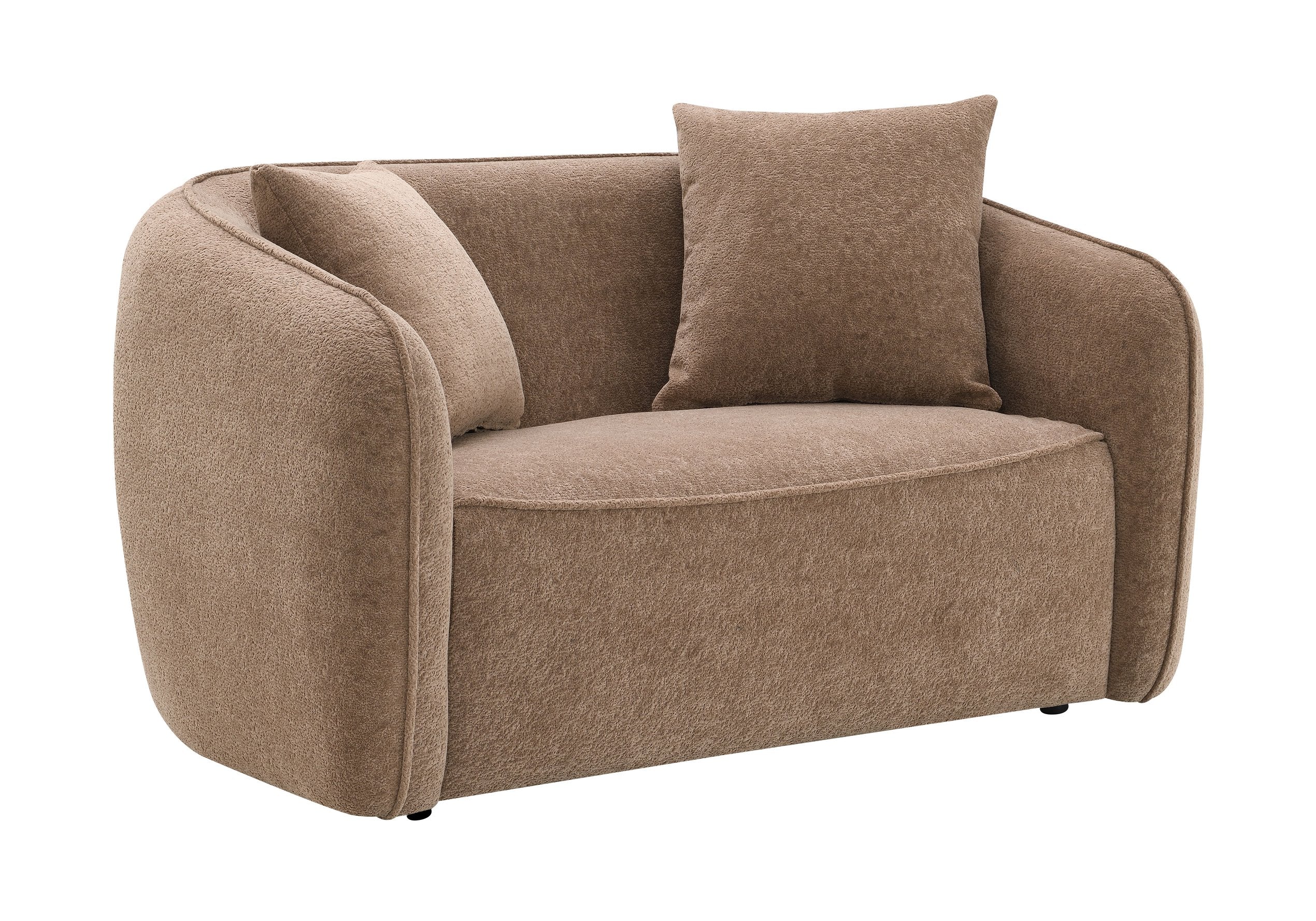 - Experience comfort and style with this elegant loveseat, crafted in a rich brown chenille fabric that adds warmth to any living space.