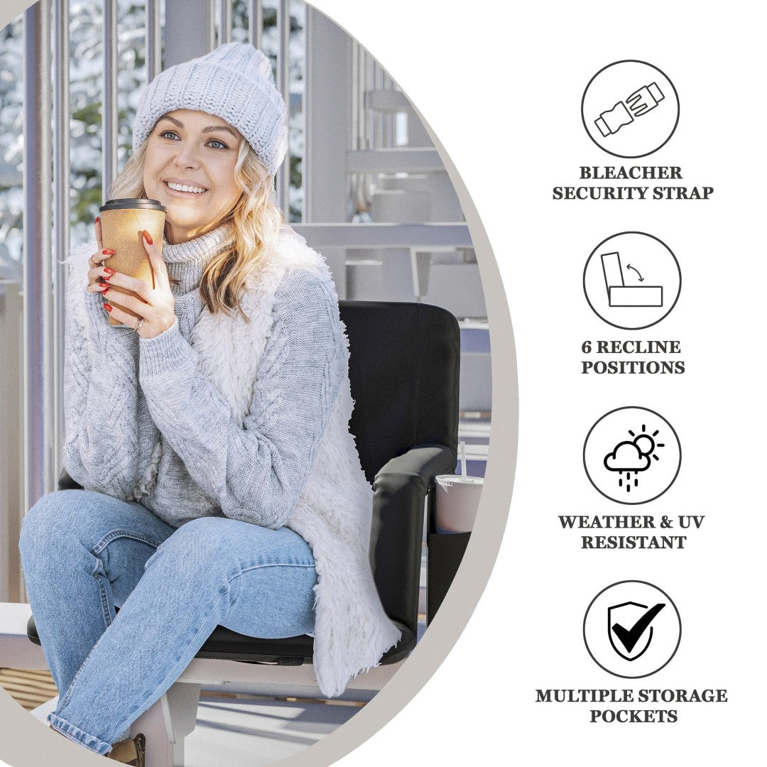 - Secure and safe: Reinforced gripper underside to prevent sliding, adjustable bleacher straps with bottom snaps to secure chair to bleachers, and a temperature-control safety sensor.