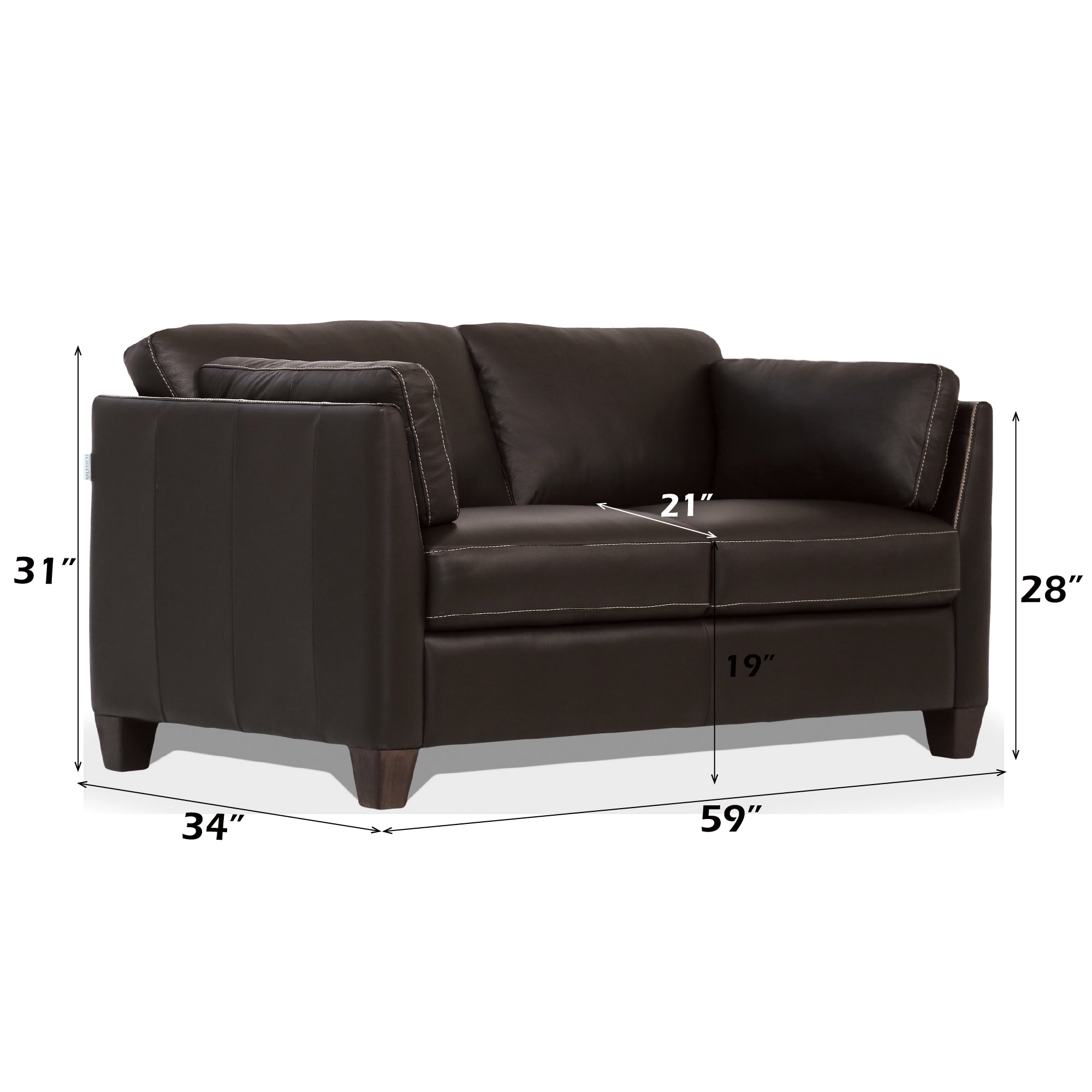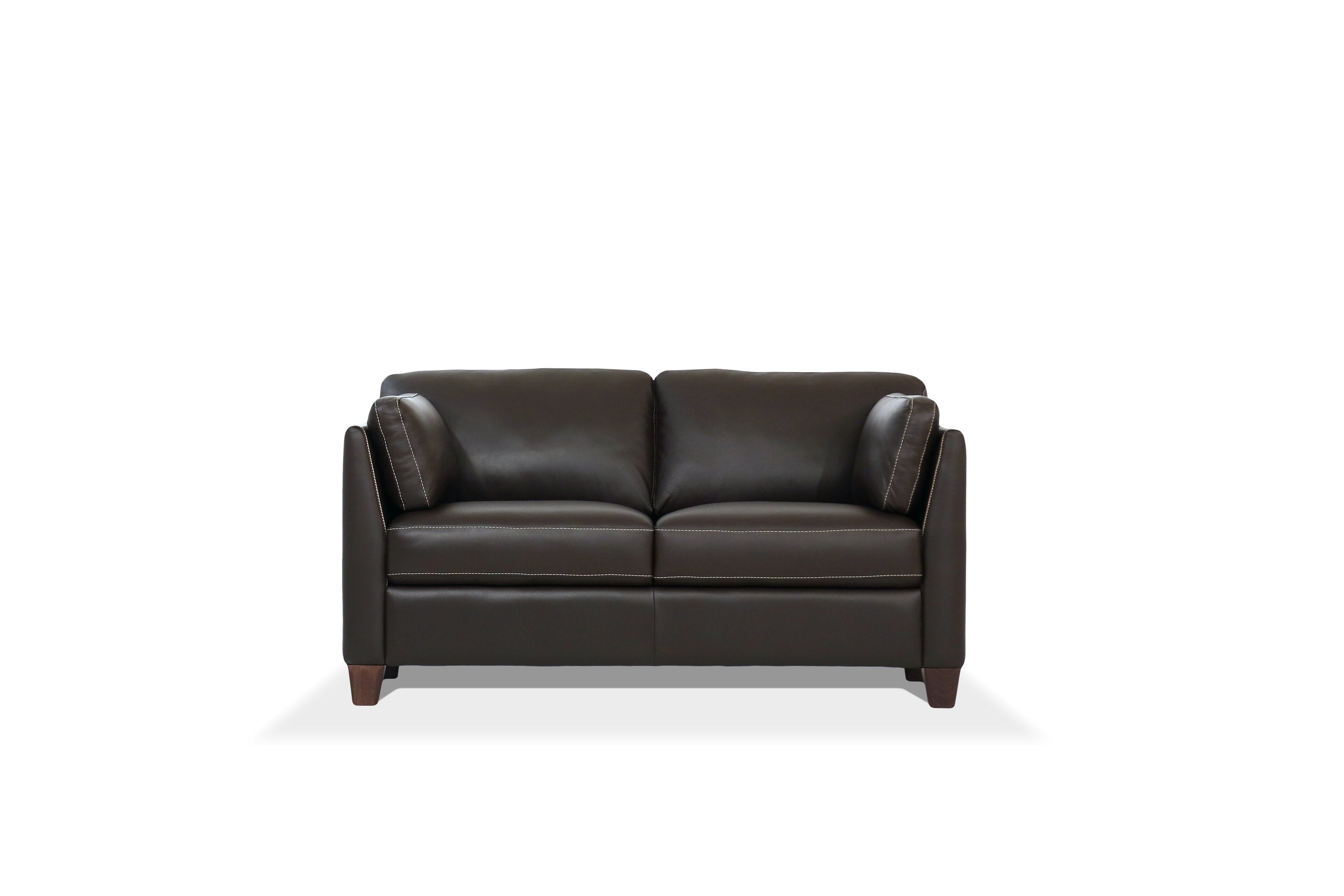 This Matias Chocolate Leather Loveseat blends Italian craftsmanship with timeless design to create a comfortable and sophisticated seating solution for living rooms, dens, or executive offices. Upholstered in rich chocolate cow leather with contrast tone stitching, it pairs a supportive webbed seat and firm back cushions with a sloped armrest and dark walnut wooden block legs for a refined, durable piece that wears beautifully over time.