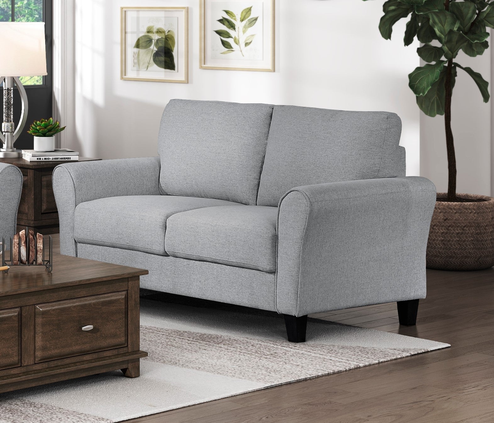 Bring timeless comfort and adaptable style to your living space with this dark gray textured loveseat. Its rounded arms, welt trim, and tailored attached cushions create a polished yet cozy silhouette that complements transitional, modern, farmhouse, or traditional interiors. Designed for everyday use, the loveseat balances supportive seating with a neutral upholstery that layers easily with your decor.