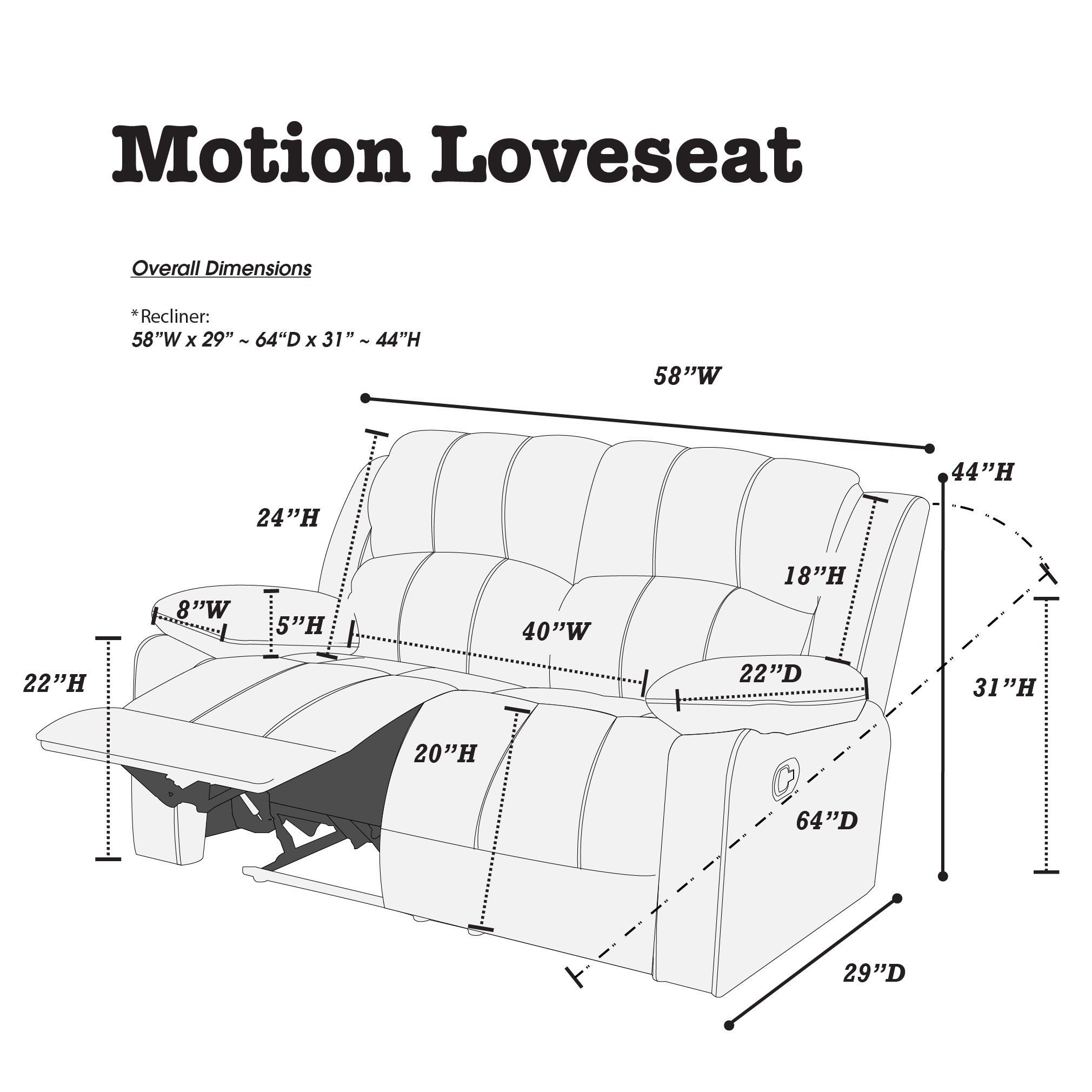- Product Dimensions: Loveseat: 58" L x 38" W x 40" H (also listed variant: 57" L x 30" W x 26" H)