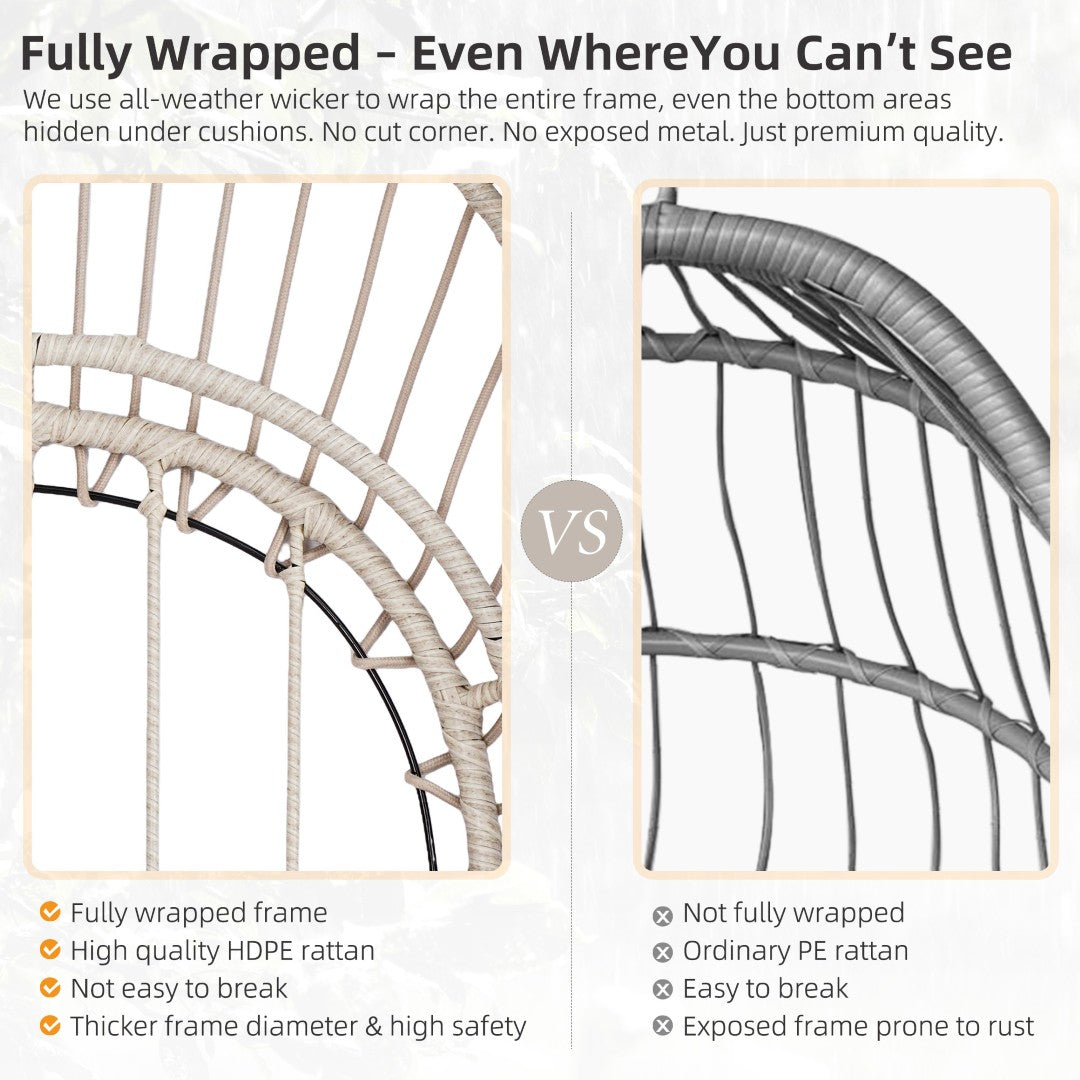 - Hand-woven and Finished Bottom. Hand-bent rattan creates a stunning sculptural frame and egg seat that cradles you in all the right place as you float a few feet above the ground. The quilted cushions are outdoor-friendly. A point not to be underestimated is the bottom is already finished woven and non-cut out,so even without a cushion, you can enjoy relaxing and cooling in the cha