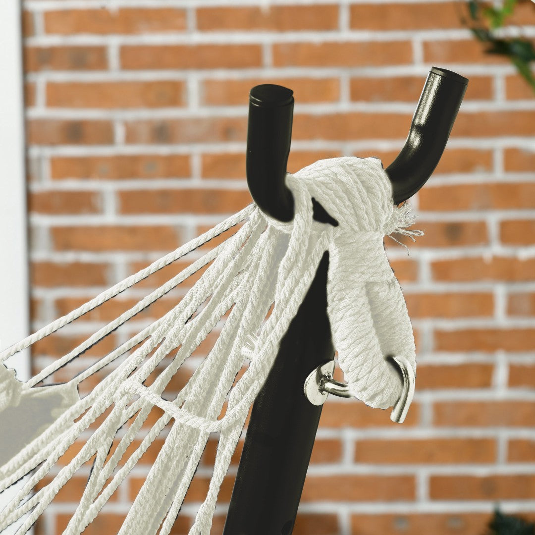 Relax in boho-chic comfort with this hanging hammock chair and freestanding stand — a stylish, weather-ready lounge solution for patios, porches, or indoor nooks. Designed for both upright sitting and reclining, it features tassel detailing, an integrated headrest pillow, and a handy side pocket so you can keep essentials within reach while you read, sip coffee, or unwind.